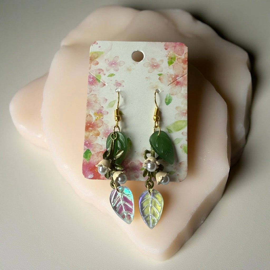 Step into a fairytale with these Enchanted Woodland Earrings. Handmade with love, they feature tiny ivory blossoms, delicate green leaves, and iridescent dangling leaf charms that shimmer beautifully in the light. Available with either silver or gold hooks, so you can choose the finish that best suits your style.