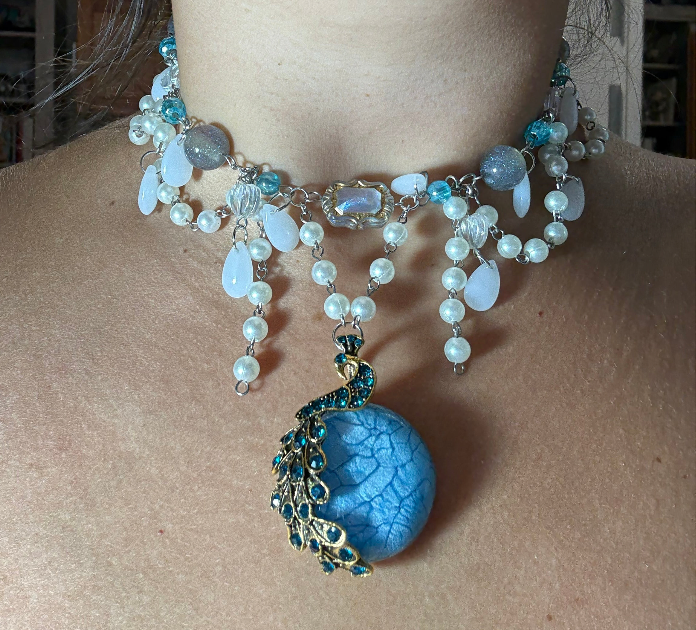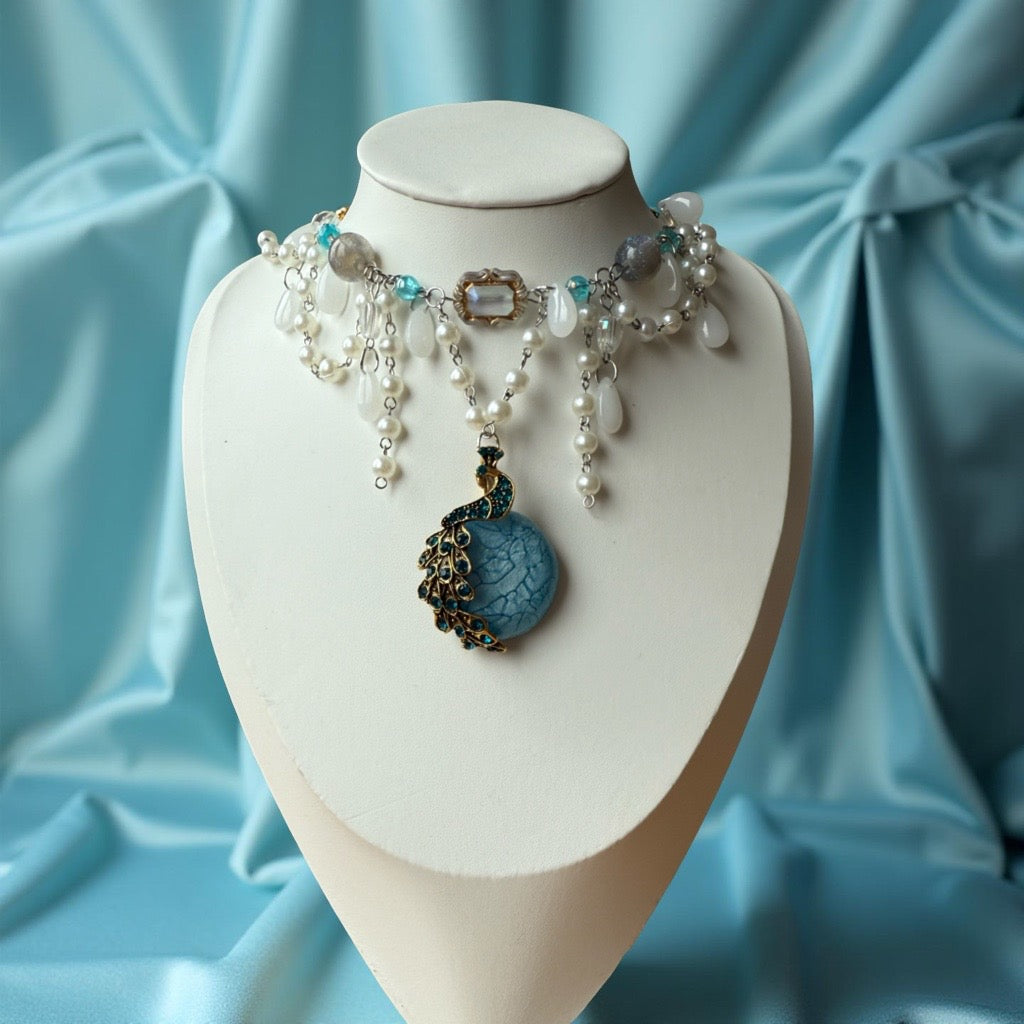Shine like royalty with Yasmine, a statement necklace that blends timeless elegance with enchanting details. Handcrafted with luminous glass pearls, delicate gemstone beads, and a striking blue pendant embraced by a peacock motif, Yasmine is a true work of wearable art.