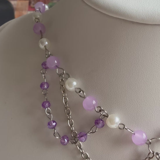 Soft, ethereal and full of crystal magic — Althea is a dreamy handmade choker inspired by moonbeams, pastel skies and gentle spiritual energy. Lavender beads, glass pearls and layered stainless-steel chains flow together beautifully, finished with a raw amethyst crystal that adds a touch of natural enchantment.