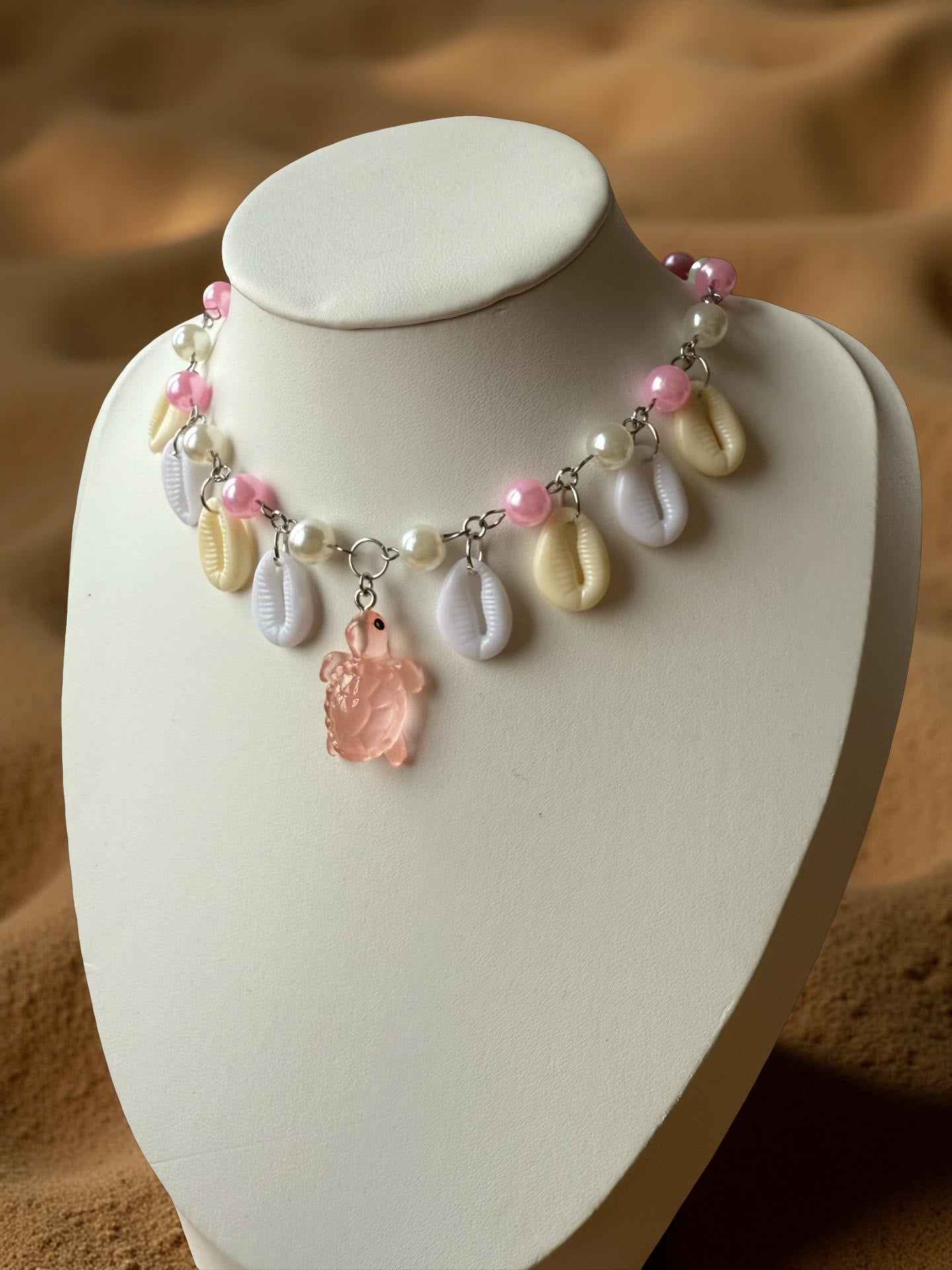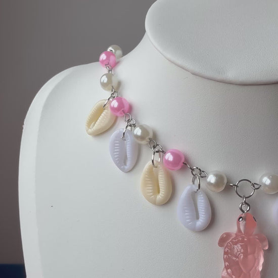 This playful yet enchanting piece features glossy pink and pearl beads, delicate cowrie shell charms, and a carved pink turtle pendant – a true talisman of the ocean.