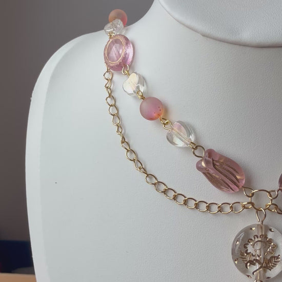 Fall under the spell of Rosalie Amorette, a romantic necklace that blends vintage charm with timeless elegance. Handcrafted with soft pink and crystal glass beads, golden details, and a beautifully detailed heart locket pendant, this piece is made to carry love and memories close to your heart.