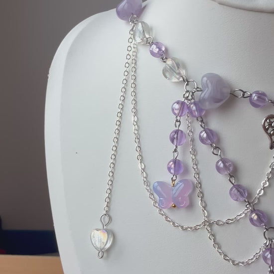 Step into a fairytale with Soraya Bloomveil, a handcrafted statement necklace that weaves together ethereal beauty and timeless romance. Made with soft lavender glass beads, butterfly charms, and an enchanting preserved rose pendant, this piece is designed to capture hearts.