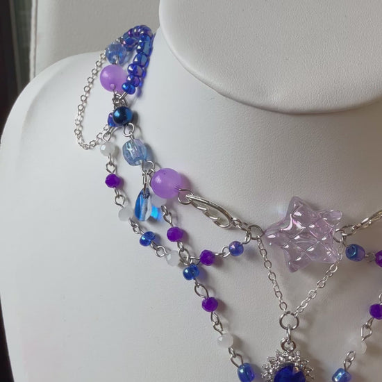 - Mixed glass and acrylic beads in cosmic blue and violet hues