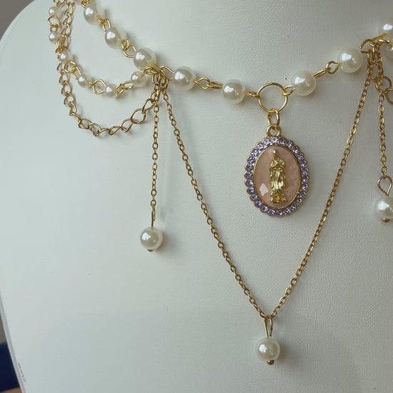 Golden chains intertwine with soft pearls, while the central medallion — reminiscent of a saint or Madonna — radiates a serene, celestial aura.