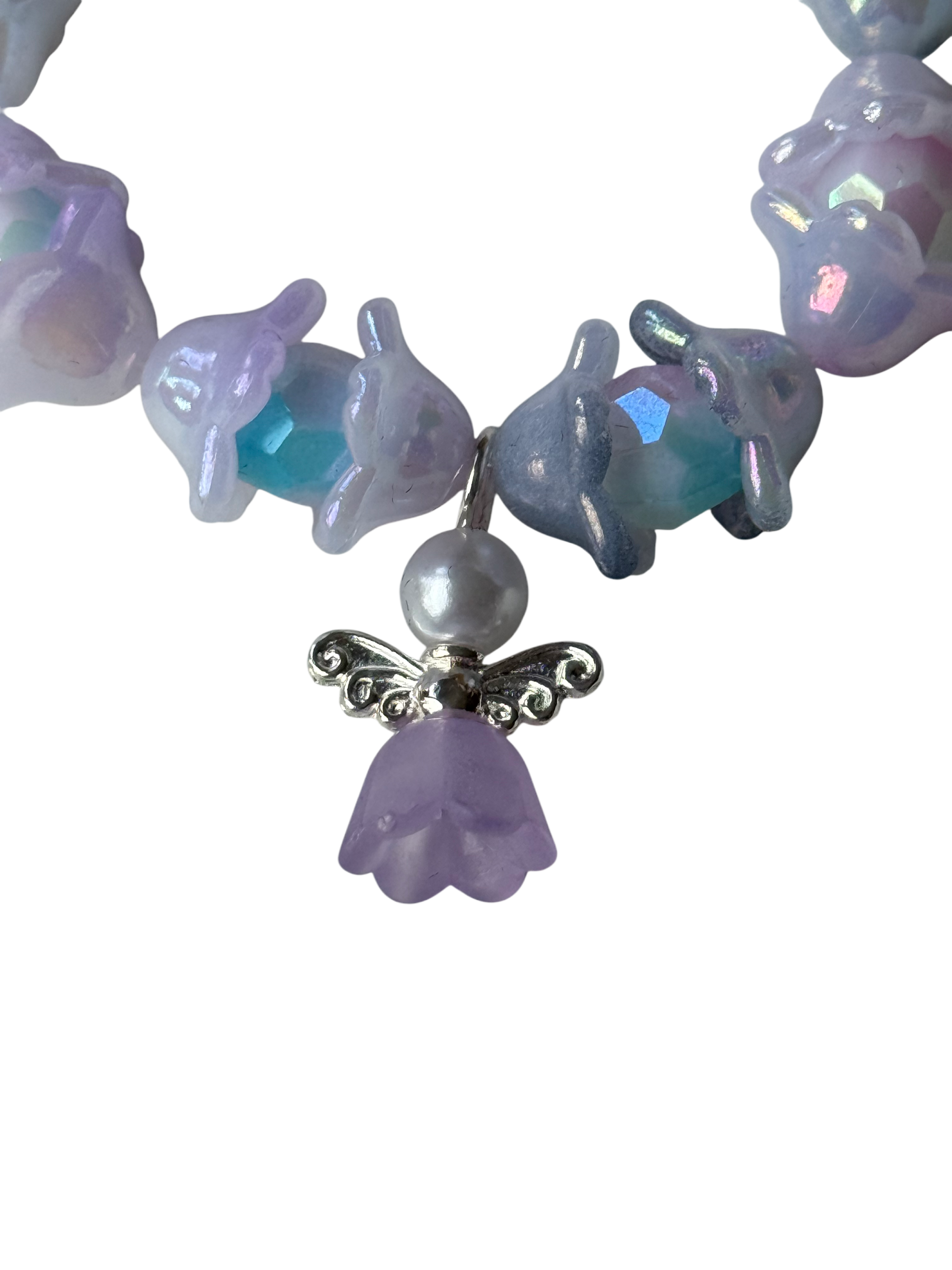 Delicate and dreamy, the Angel Blossom Bracelet is a true fairy tale on your wrist. Crafted with iridescent floral beads wrapped around soft white pearls, this elastic bracelet shimmers with every movement. The highlight of this piece is the charming silver angel pendant, adding a touch of grace and protection to your style. Perfect for anyone who loves whimsical, ethereal accessories.