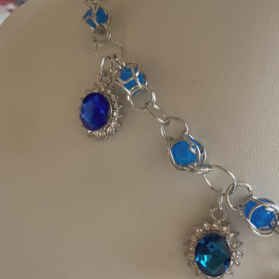 At its center hangs the Flower of Life symbol — an ancient sacred geometry pattern representing creation, harmony, and divine connection. Deep blue crystal charms woven into the chainmail add a regal, celestial touch.