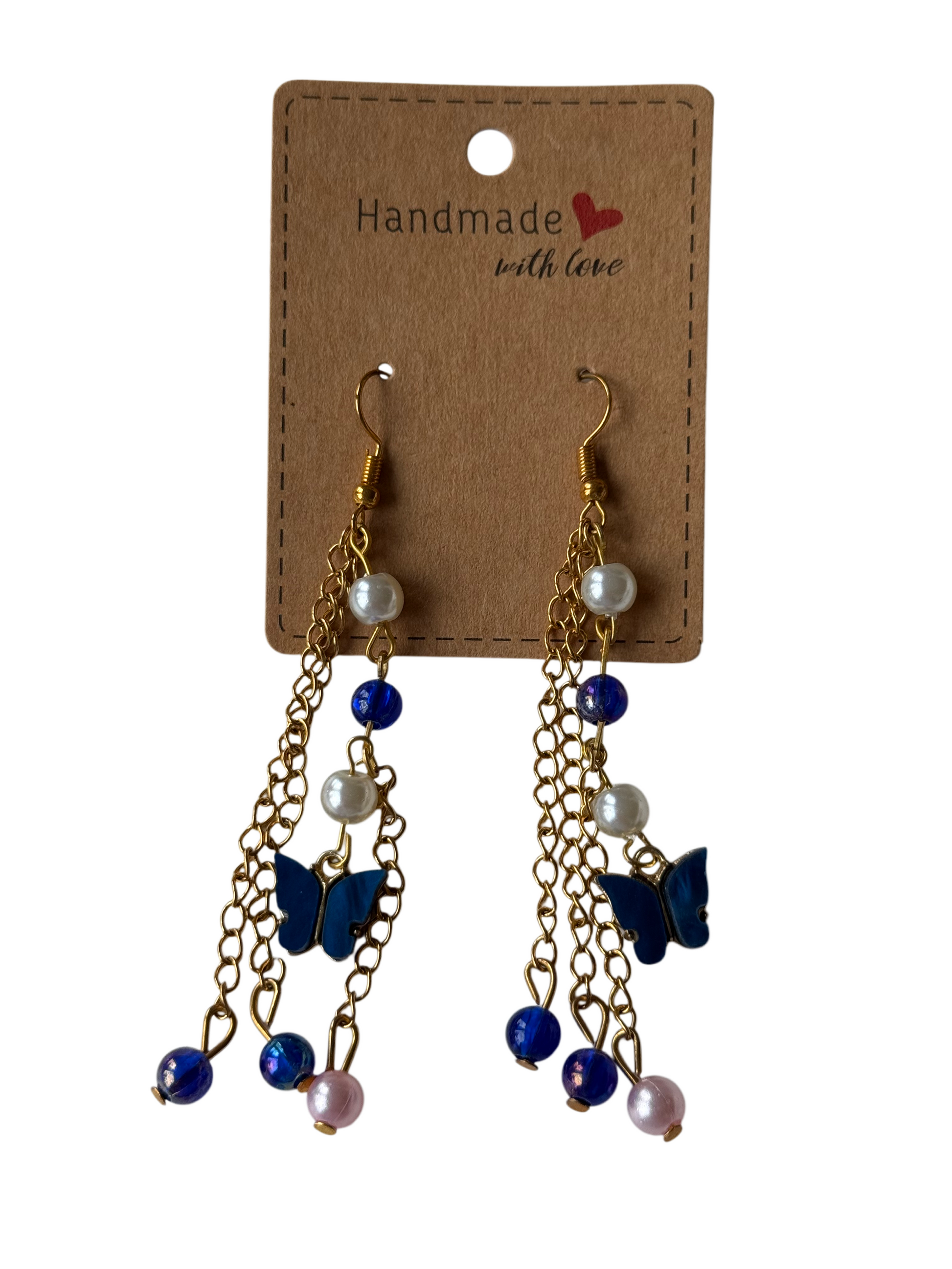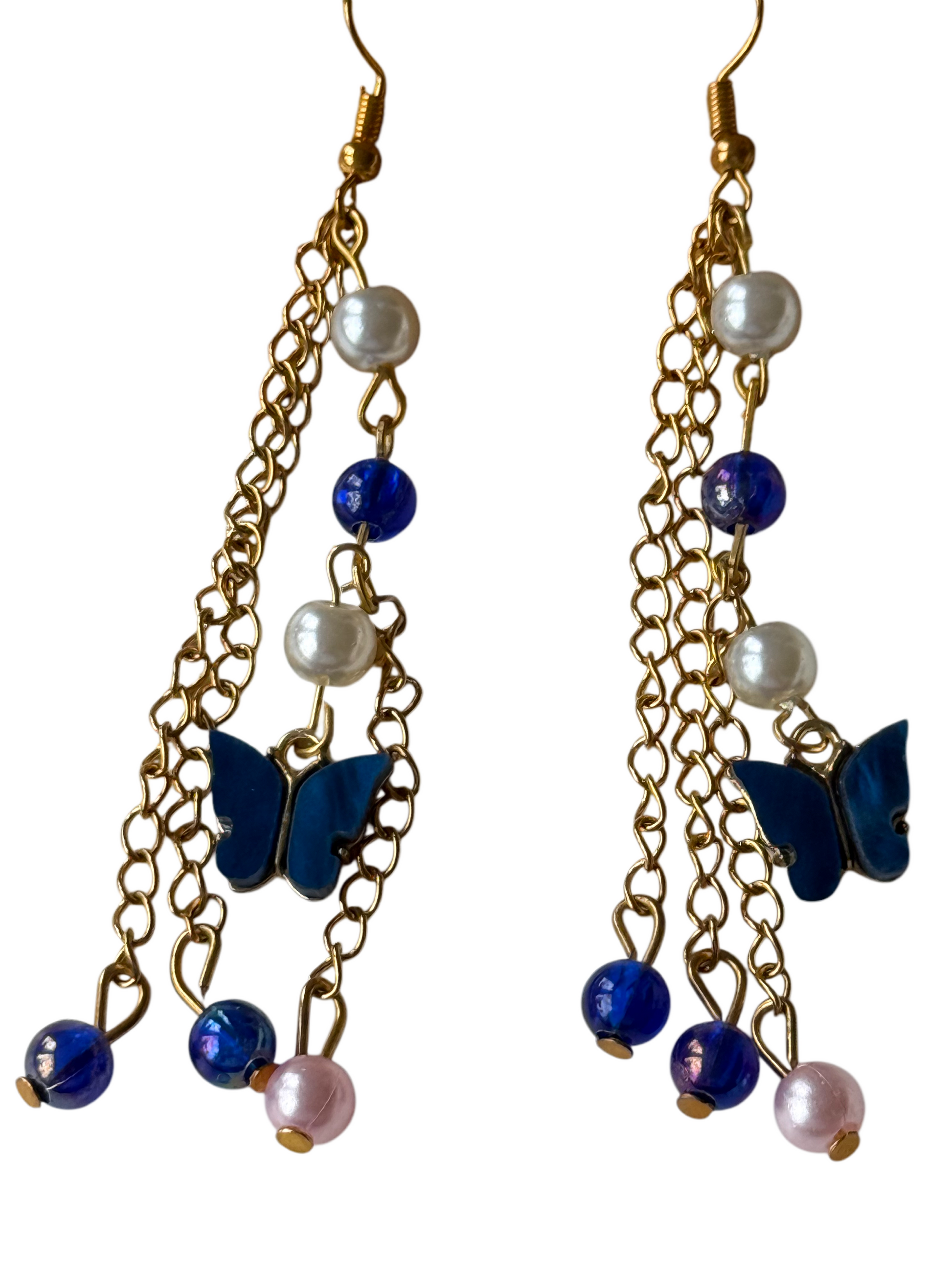Float like a breeze with our Blue Breeze earrings — a delicate cascade of chains, pearls, and butterfly magic. These handmade earrings feature deep blue enamel butterfly charms, draping golden chains, and a mix of pearly and iridescent beads that shimmer with every move. Lightweight yet full of personality, they’re a perfect blend of elegance and whimsical charm, ideal for special occasions or adding a playful twist to your daily look.