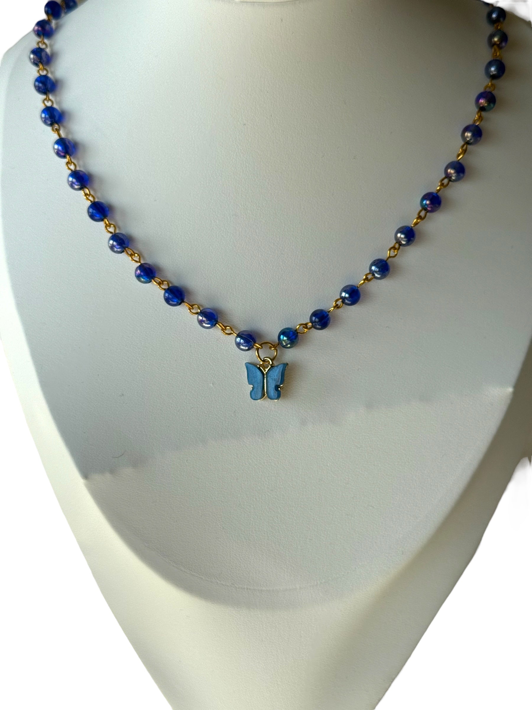 Delicate and dreamy, this necklace is a tribute to transformation and quiet strength. Crafted with deep blue beads and linked in a classic gold-tone chain, it features a hand-painted butterfly pendant that gently catches the light. Whether worn alone or layered, it's a subtle yet enchanting piece that speaks to your inner glow.