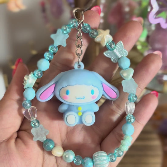 Cute, dreamy, and full of pastel magic – this handmade beaded keychain features a soft blue bunny character with rosy cheeks, paired with beads in ocean-blue, teal, and pearl tones. Decorated with star, flower, and butterfly details, it’s the perfect kawaii accessory for your bag, keys, or phone case. A sweet gift idea for collectors and pastel lovers.