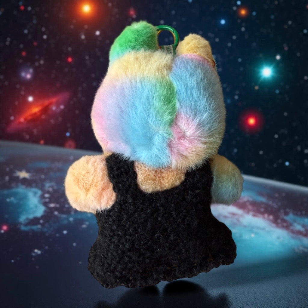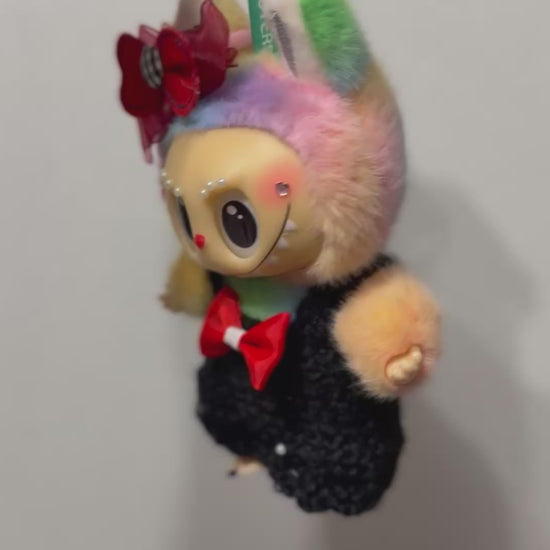 This adorable Lafufu is dressed in a handmade black dress with a bold red bow, paired with a matching ribbon headband. Its pastel rainbow fur adds a playful twist to the chic, fashion-inspired look – a mix of classy and kawaii.