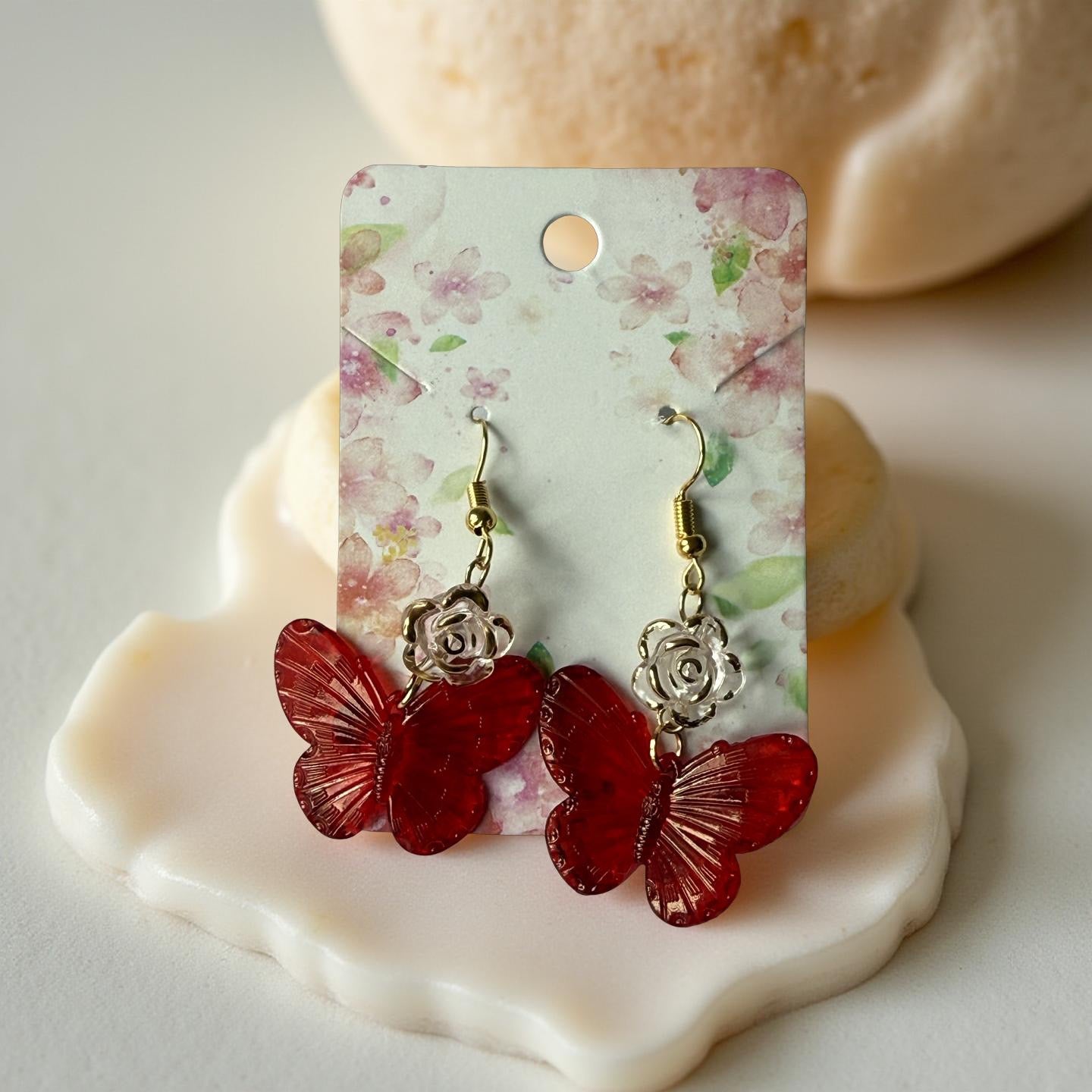 Graceful and bold, the Crimson Butterfly Earrings feature deep red butterfly charms paired with delicate silver rose details. A perfect balance of romance and statement, these earrings will bring a touch of magic to any outfit. Lightweight and easy to wear, ideal for fairycore and romantic styles.