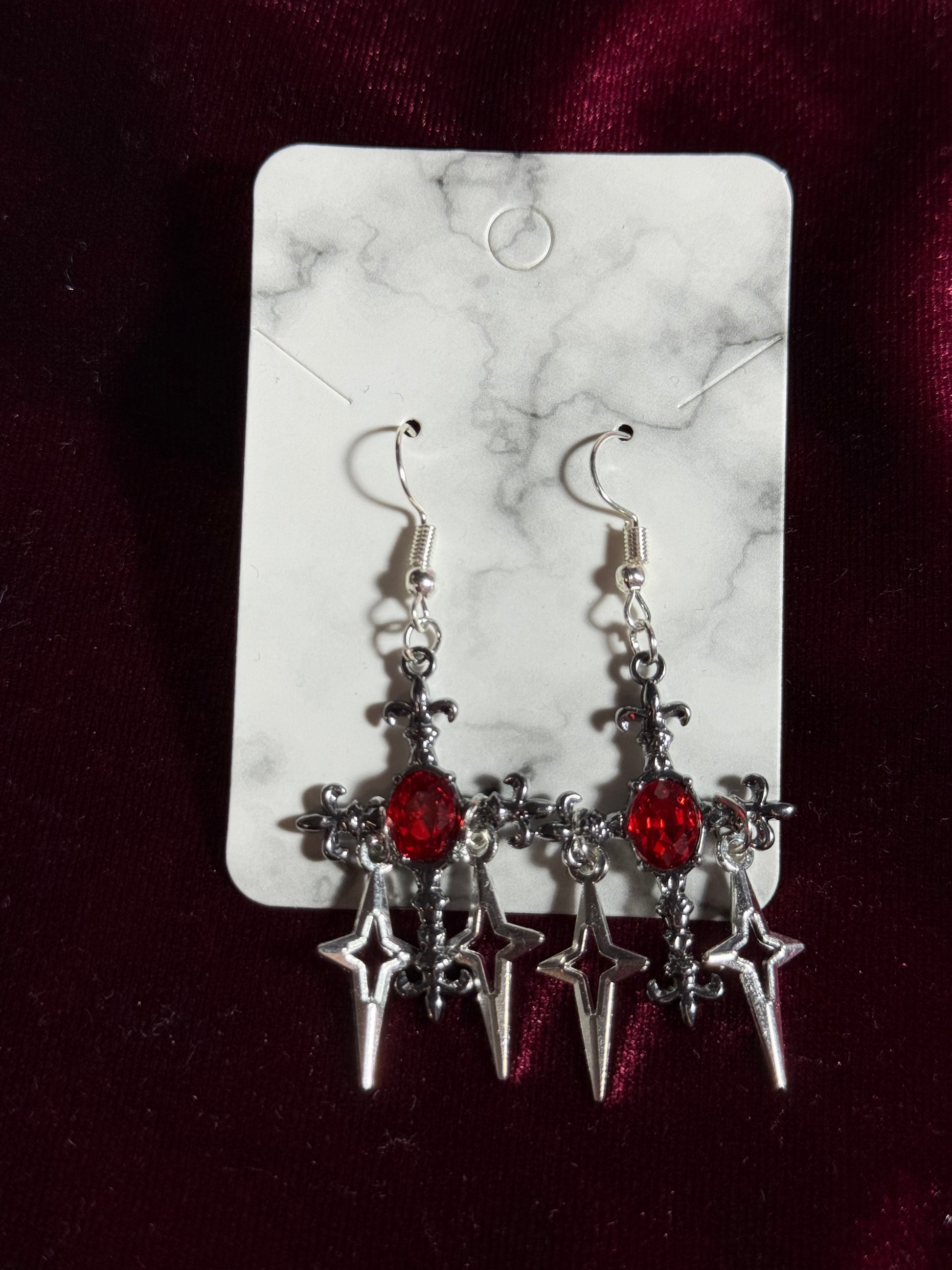 Striking gothic earrings featuring deep red crystal accents and ornate cross charms.