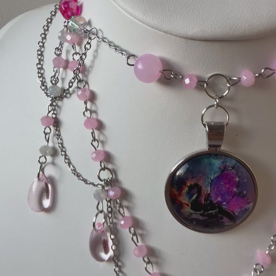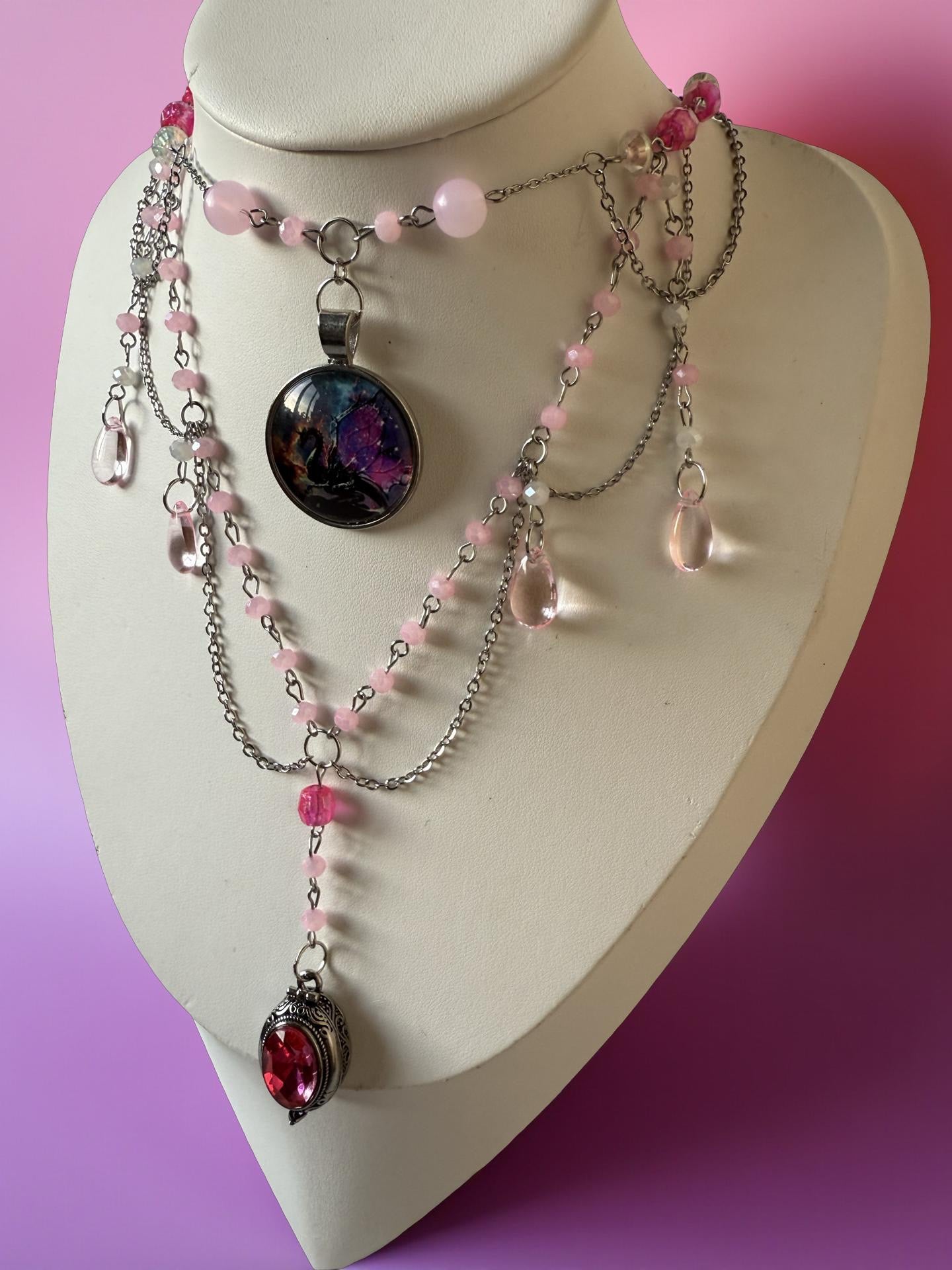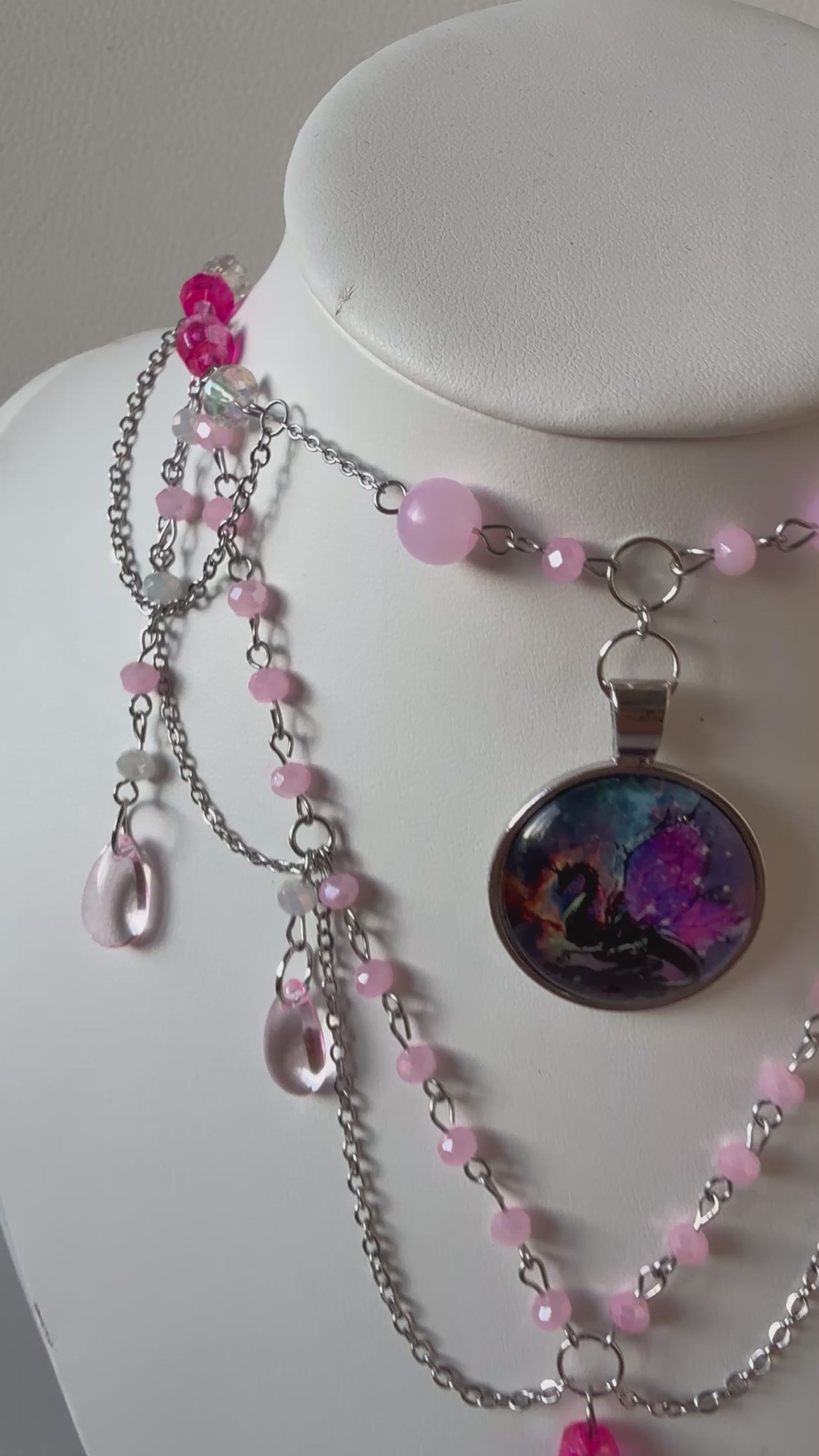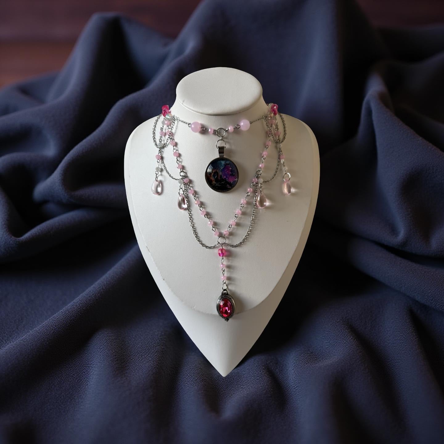 Handcrafted with layers of pink glass beads, crystal drops, and dual pendants symbolizing fire and starlight, this piece captures the dance between power and elegance.
