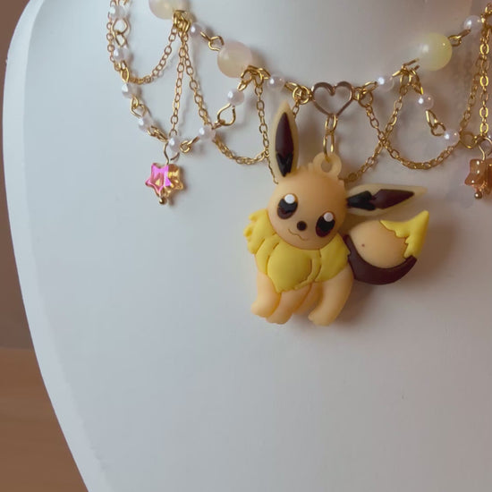 This dreamy choker features layered gold chain links, opal glass beads, and a soft pastel star charm — all highlighting a charming Eevee pendant as the centerpiece. Perfect for fans who love a touch of warmth, nostalgia, and sparkle. 🌟