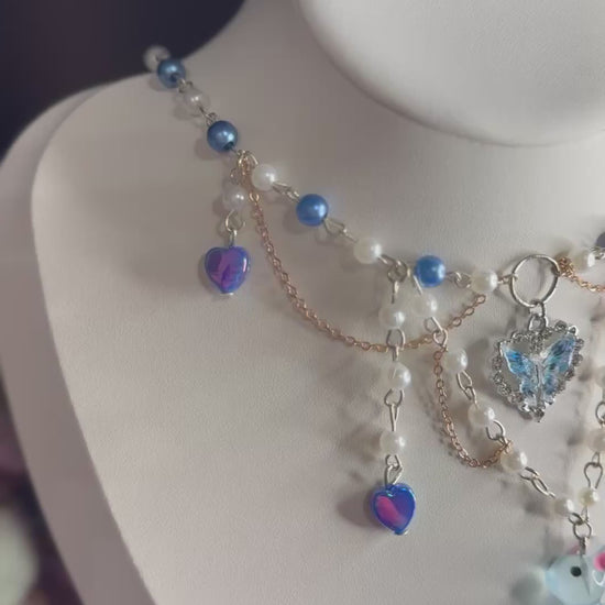 This multi-layered necklace features silver-tone chain links, soft acrylic pearls, metallic blue hearts, and dangling beaded details that catch the light beautifully. At its center, a delicate butterfly framed in a vintage-style charm radiates magic, while a translucent blue bunny pendant adds a unique, whimsical touch.