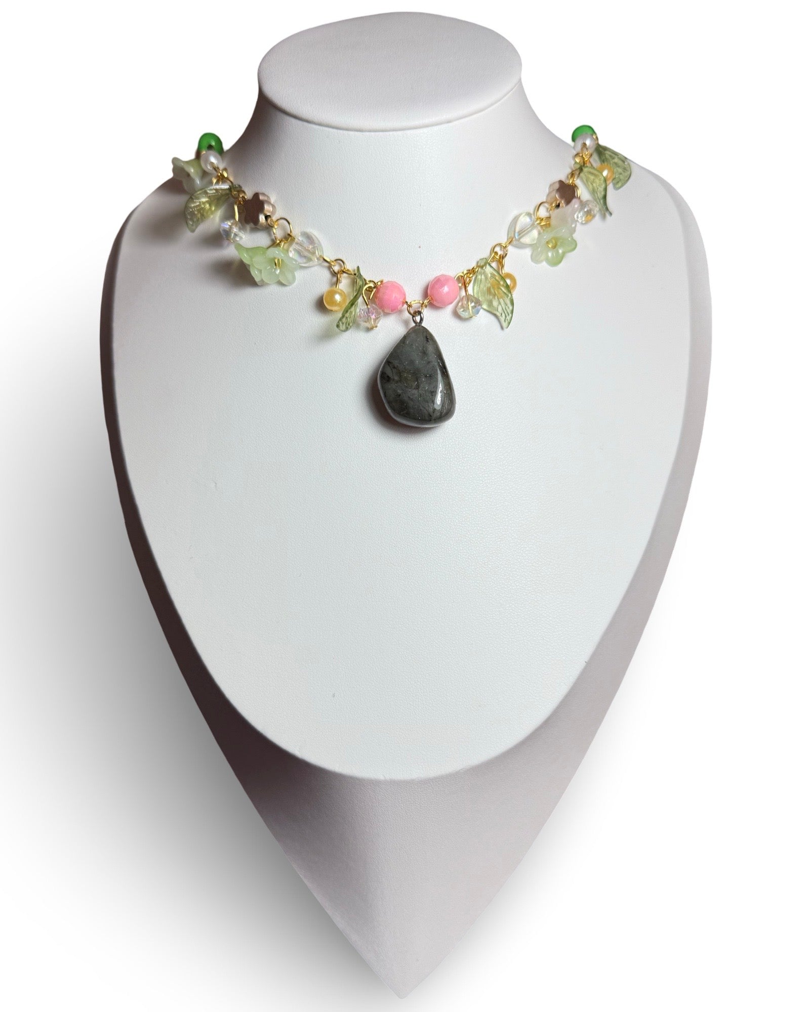 Step into a whimsical forest realm with Elowen, a delicate necklace adorned with fairy-inspired blossoms, soft glass leaves, and shimmering beads. At the center rests a raw natural gemstone – grounding and magical, like a treasure hidden beneath ancient roots.