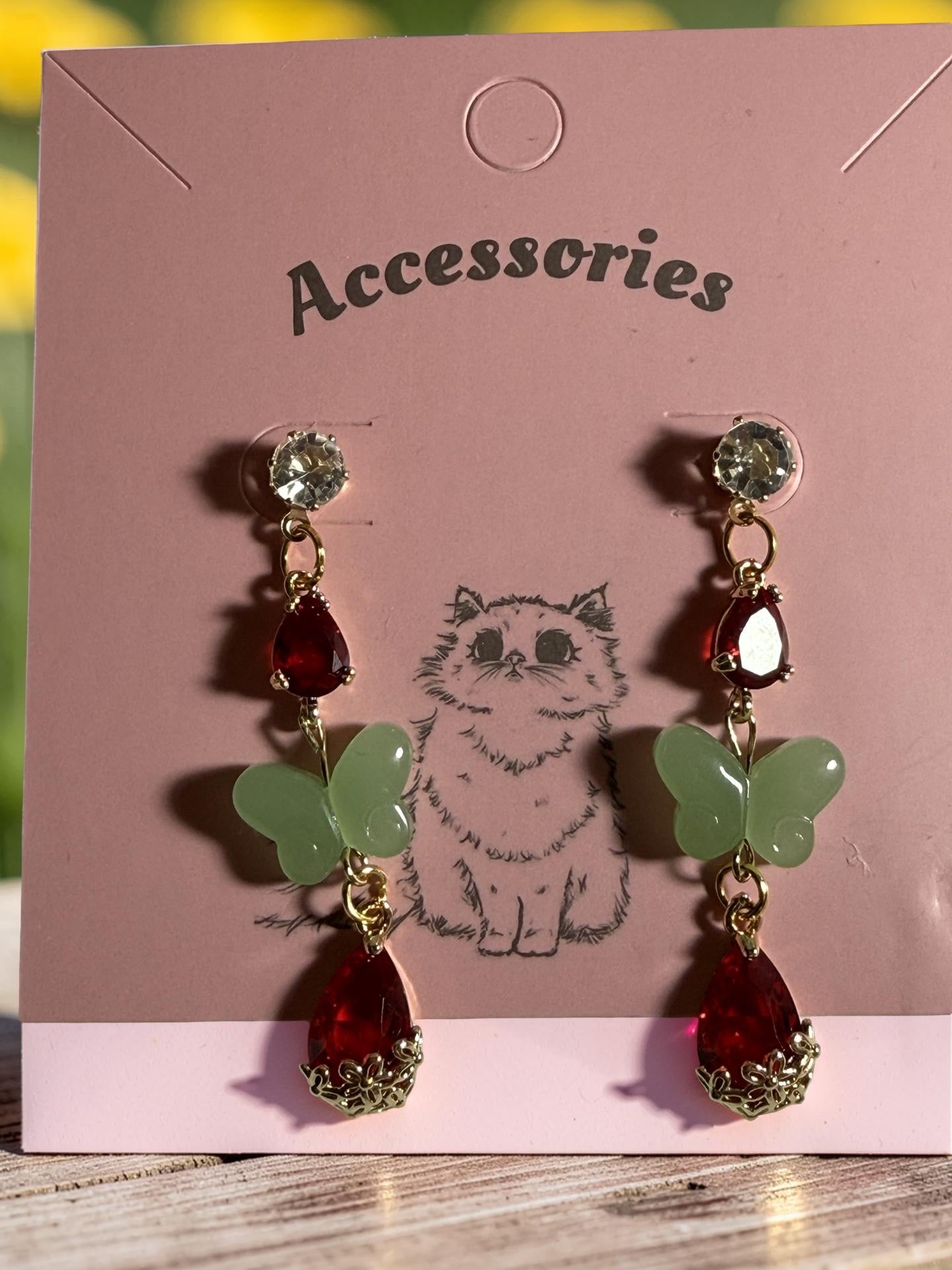 These delicate earrings feature sparkling crystal studs, deep crimson drop charms, and soft green butterfly details that bring a touch of enchanted forest beauty to your jewelry collection. The combination of rich red crystals and dreamy butterfly accents creates a whimsical yet elegant design inspired by nature and fairy tales.
