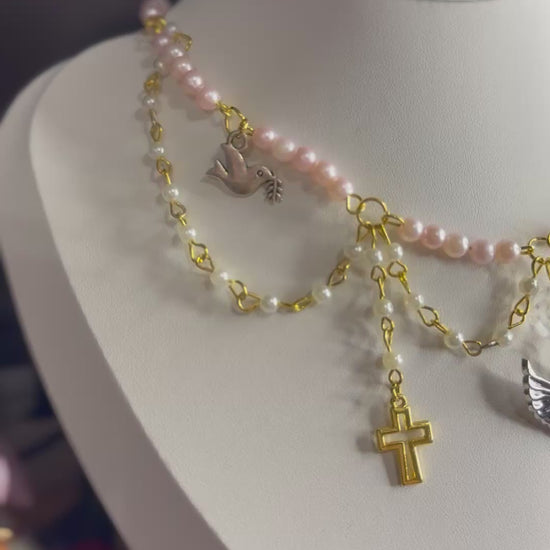 Crafted from gold-tone chain links and delicate blush-pink acrylic pearls, this necklace features cascading layers adorned with symbolic charms: a majestic silver-winged heart, two shimmering gold crosses, and celestial accents of a white dove.