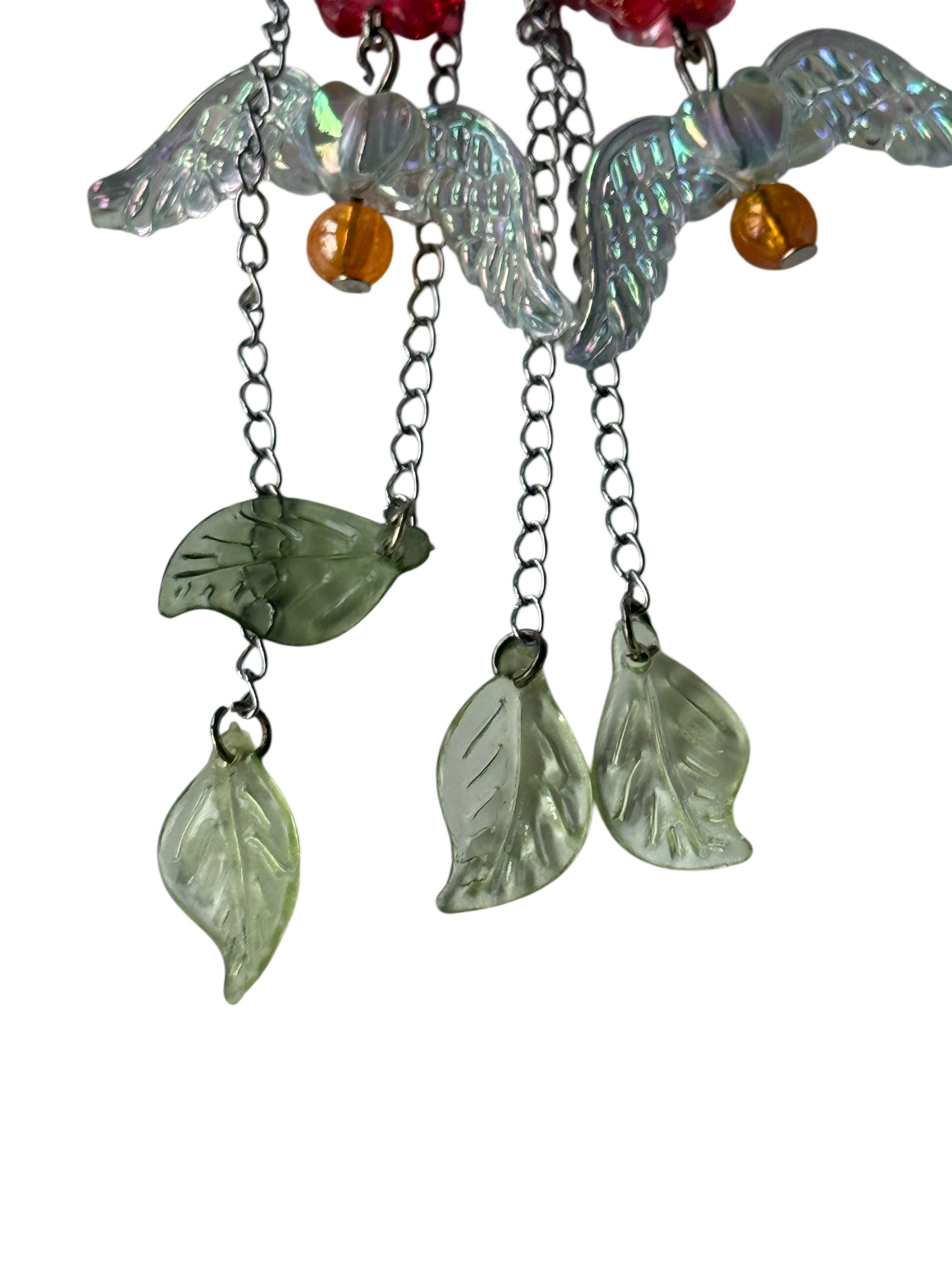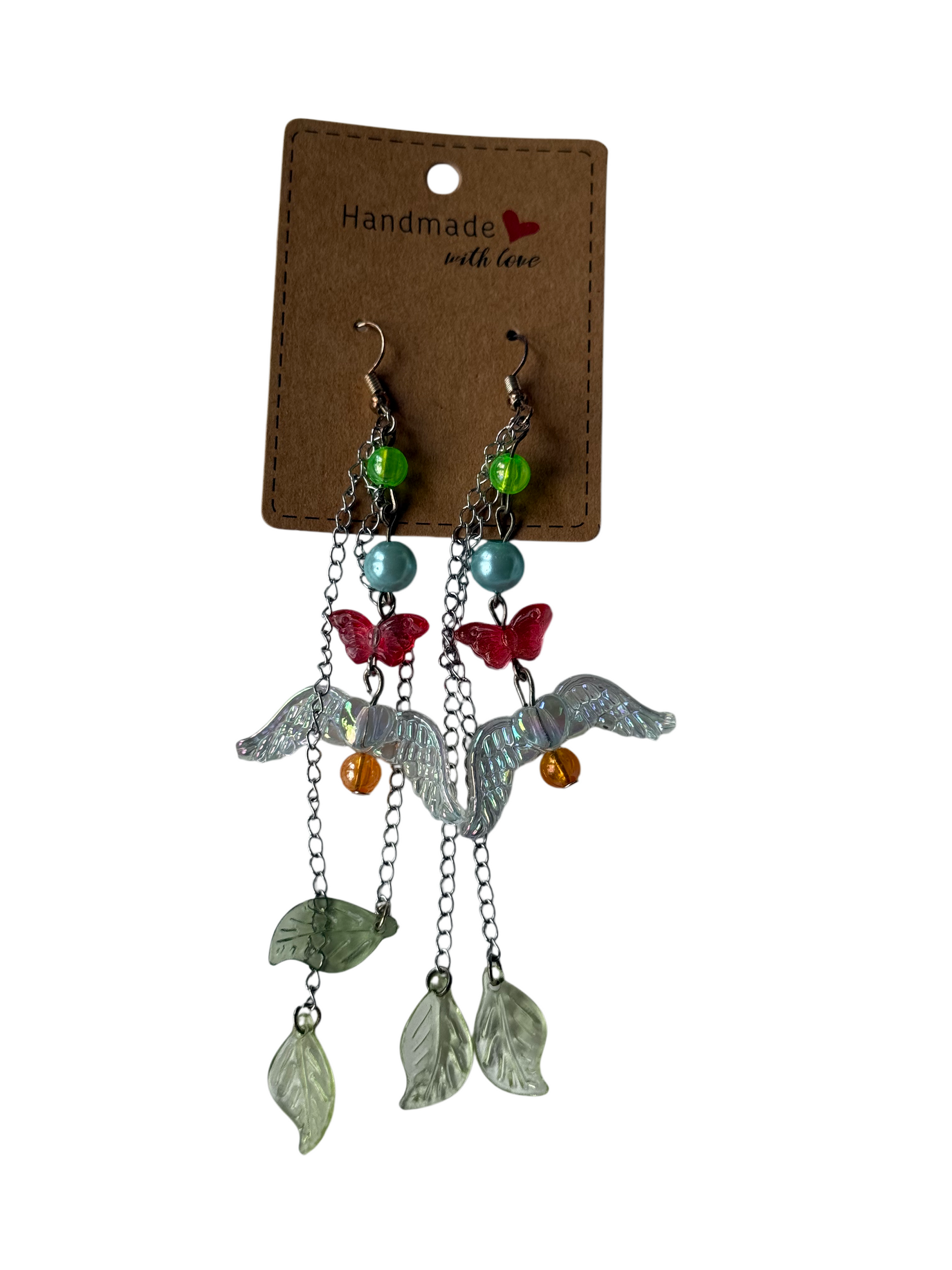 Materials: Resin butterflies and wings, acrylic leaves, pearl-style and translucent beads, silver-tone chains, stainless steel hooks (nickel-free)