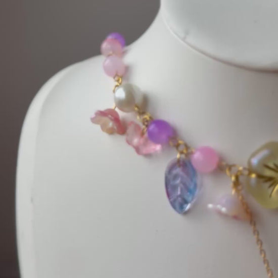 This handmade necklace is crafted from stainless steel with an adjustable length and secure clasp. It features pastel beads in lilac, pink, and pearl tones, delicate leaf charms, and a golden flower centerpiece. From the flower hangs a dainty butterfly pendant, symbolizing transformation, joy, and the magic of spring.