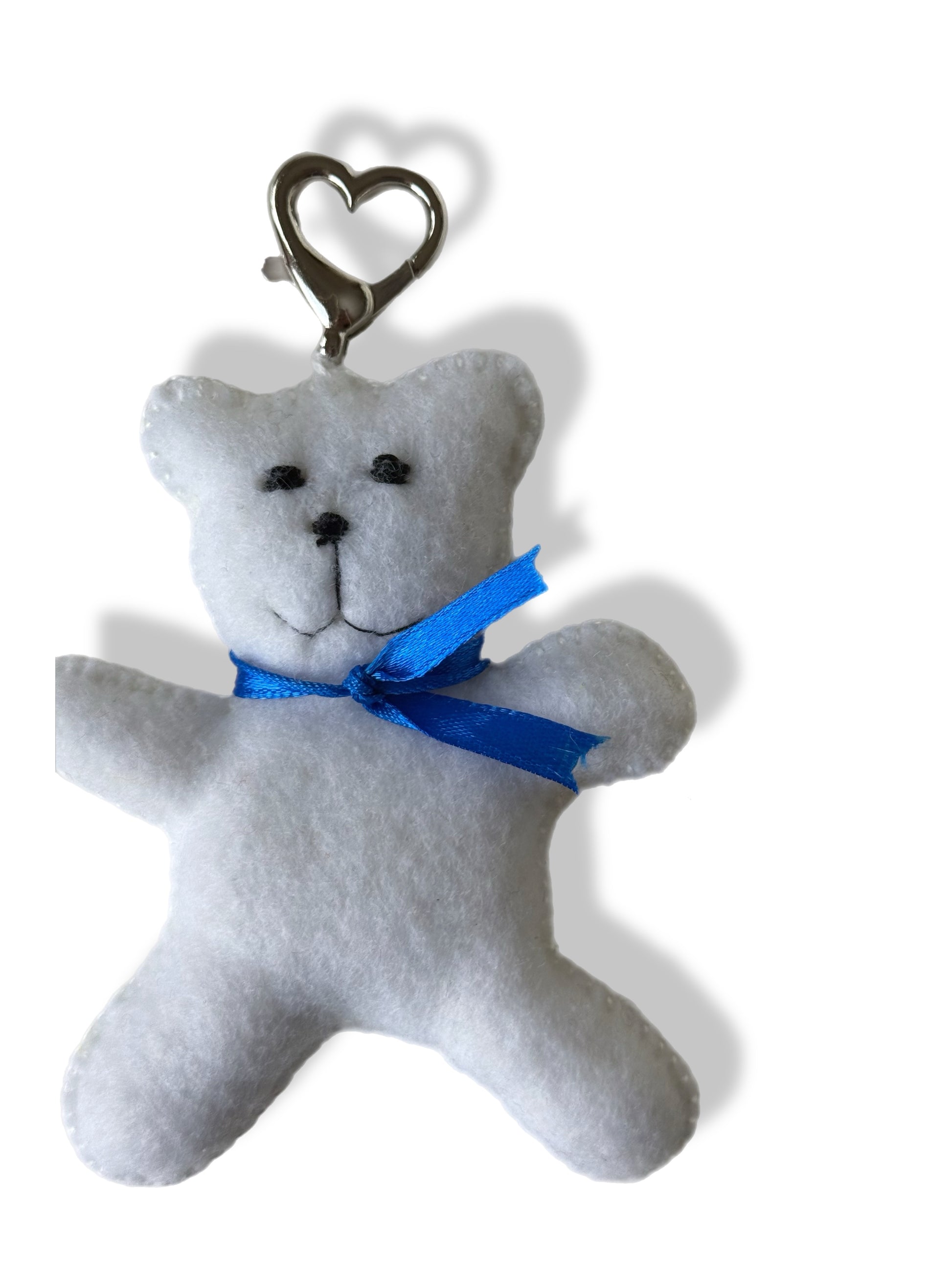 Add a touch of charm to your keys, bag, or backpack with this handmade teddy bear keychain. Crafted from soft, hypoallergenic felt and filled with lightweight thermofil, this cuddly accessory is as safe as it is cute – perfect even for children aged 3 and up. Its friendly stitched face and bright blue ribbon make it a lovely gift or a sweet everyday companion. A heart-shaped metal clasp lets you attach it securely wherever you like.