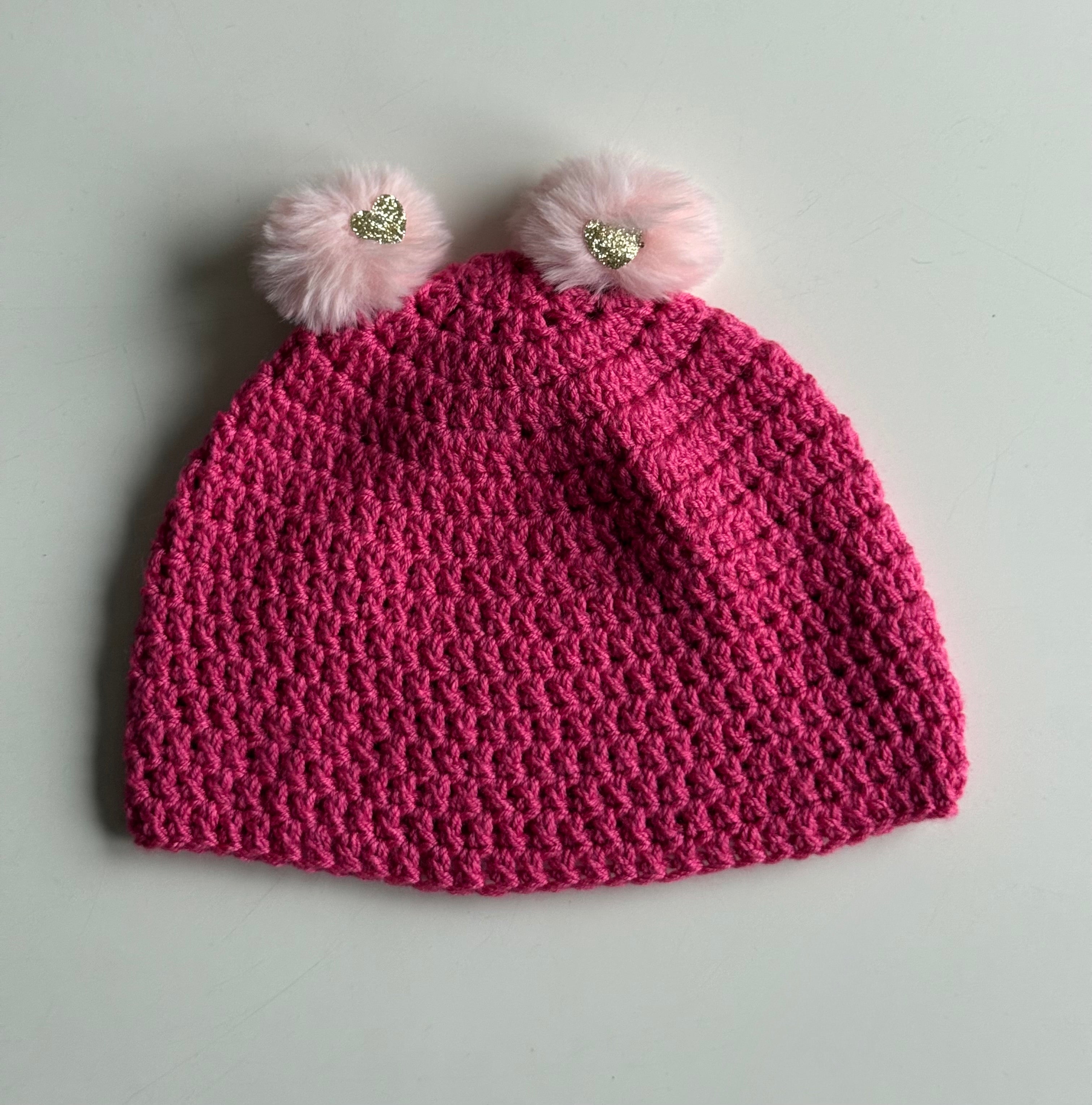 Two fluffy light-pink pom-poms sit on top, creating a cute bear-ear effect. Each pom-pom is decorated with a sparkling gold heart accent, adding an extra touch of sweetness and charm to the design.