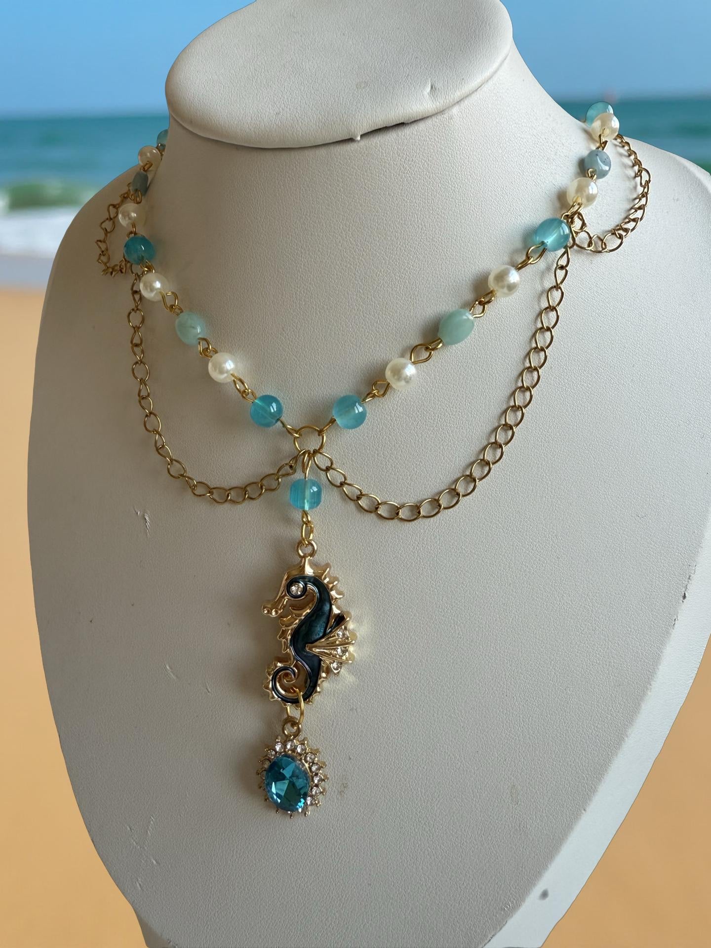 This enchanting necklace features soft ocean-blue beads, pearly accents, golden chains, and a stunning seahorse pendant with a deep blue crystal. A perfect piece for mermaid souls and sea-aesthetic lovers.