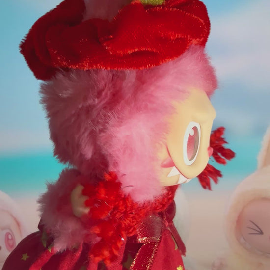 This authentic collectible is styled in a magical Christmas outfit — featuring a red velvet hat with shimmering gold reindeer antlers, a soft pink faux-fur hood, a handmade knitted red scarf, and a star-pattern holiday skirt finished with a satin bow. The glossy Pop Mart eyes and signature sculpt give this plush charm a premium look that collectors adore.