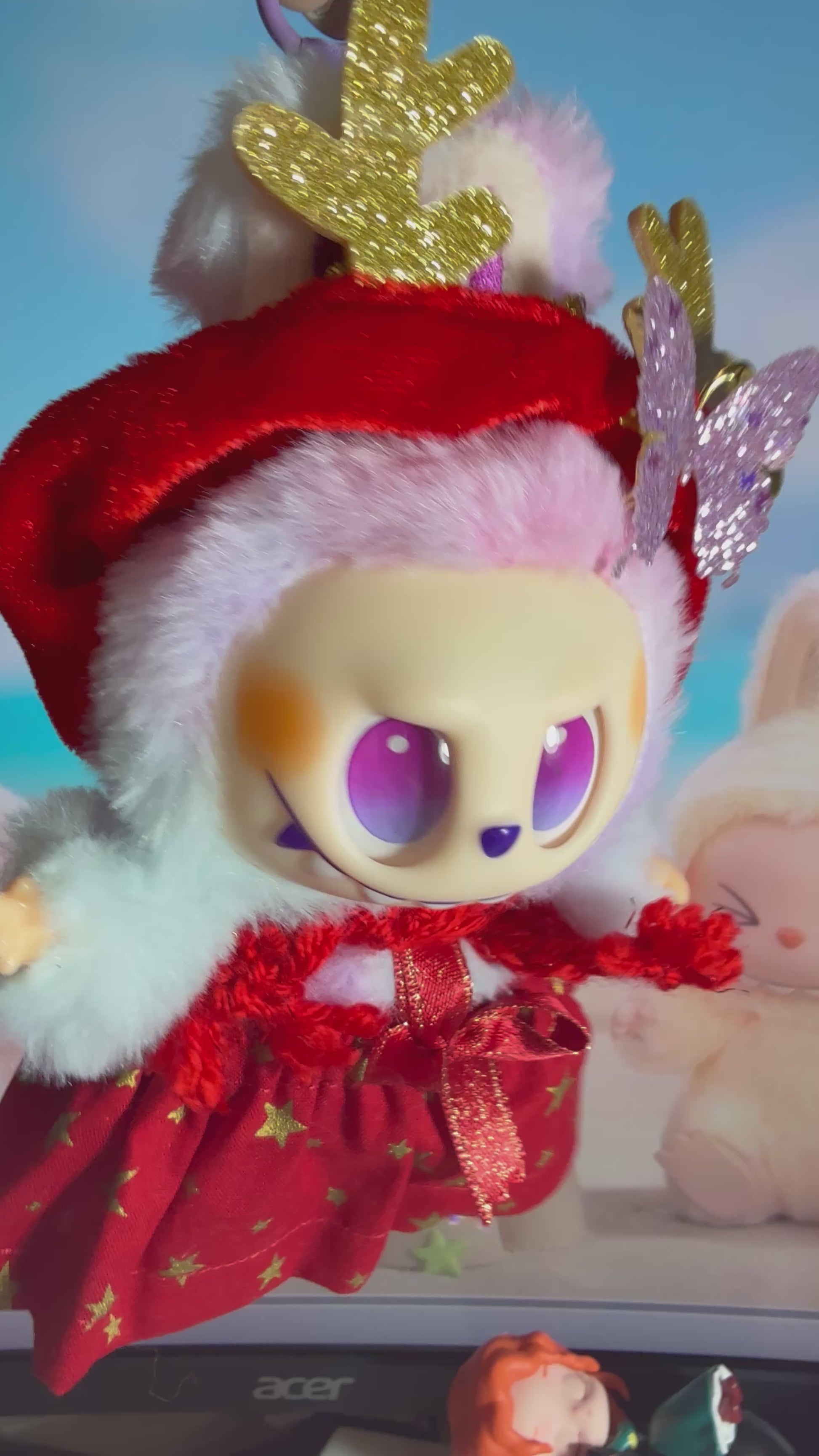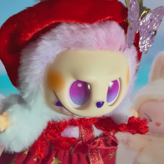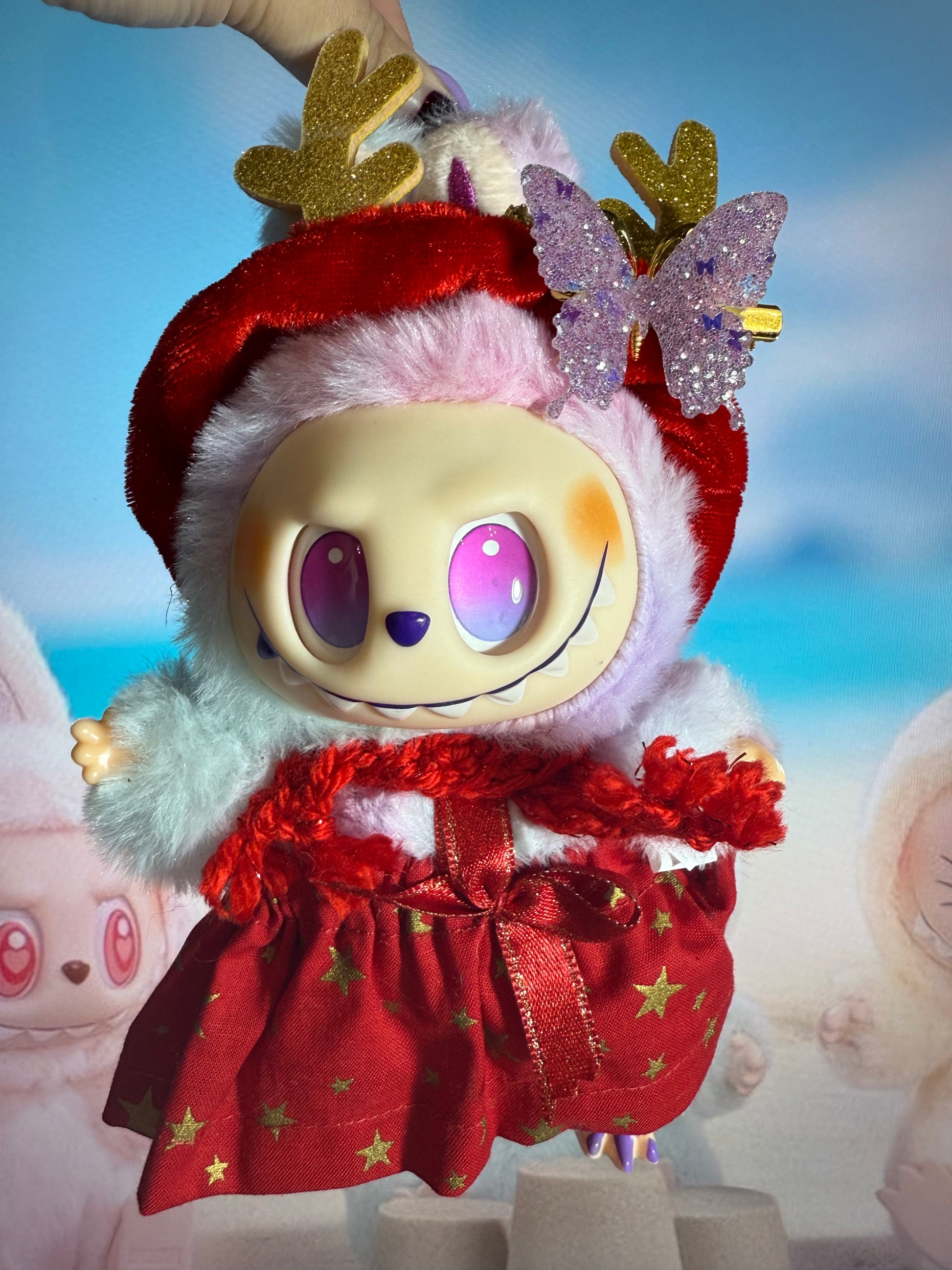 This fan-made Christmas plush charm shines with cozy winter vibes — dressed in a festive red starry skirt with a satin bow, wrapped in a handmade knitted red scarf, and crowned with a soft red velvet hat featuring glittery gold reindeer antlers. A sparkly lavender butterfly clip adds an enchanting fairycore touch, making this plush a perfect blend of cute, festive, and magical. ✨