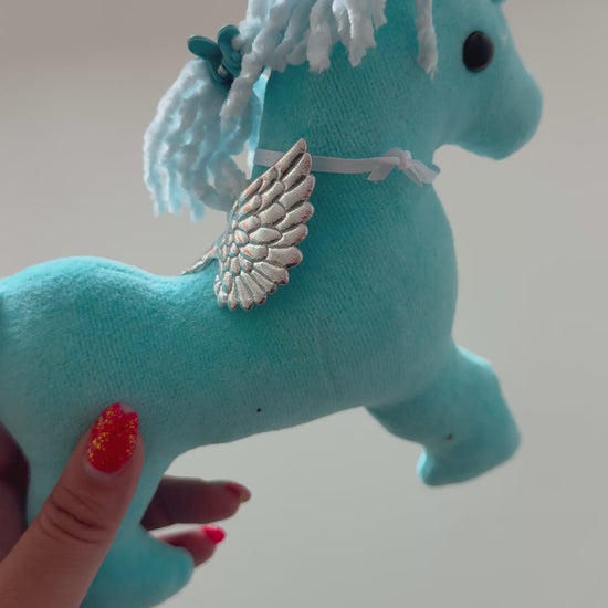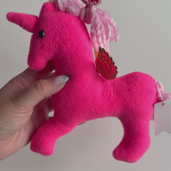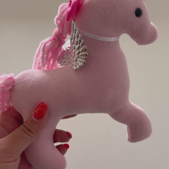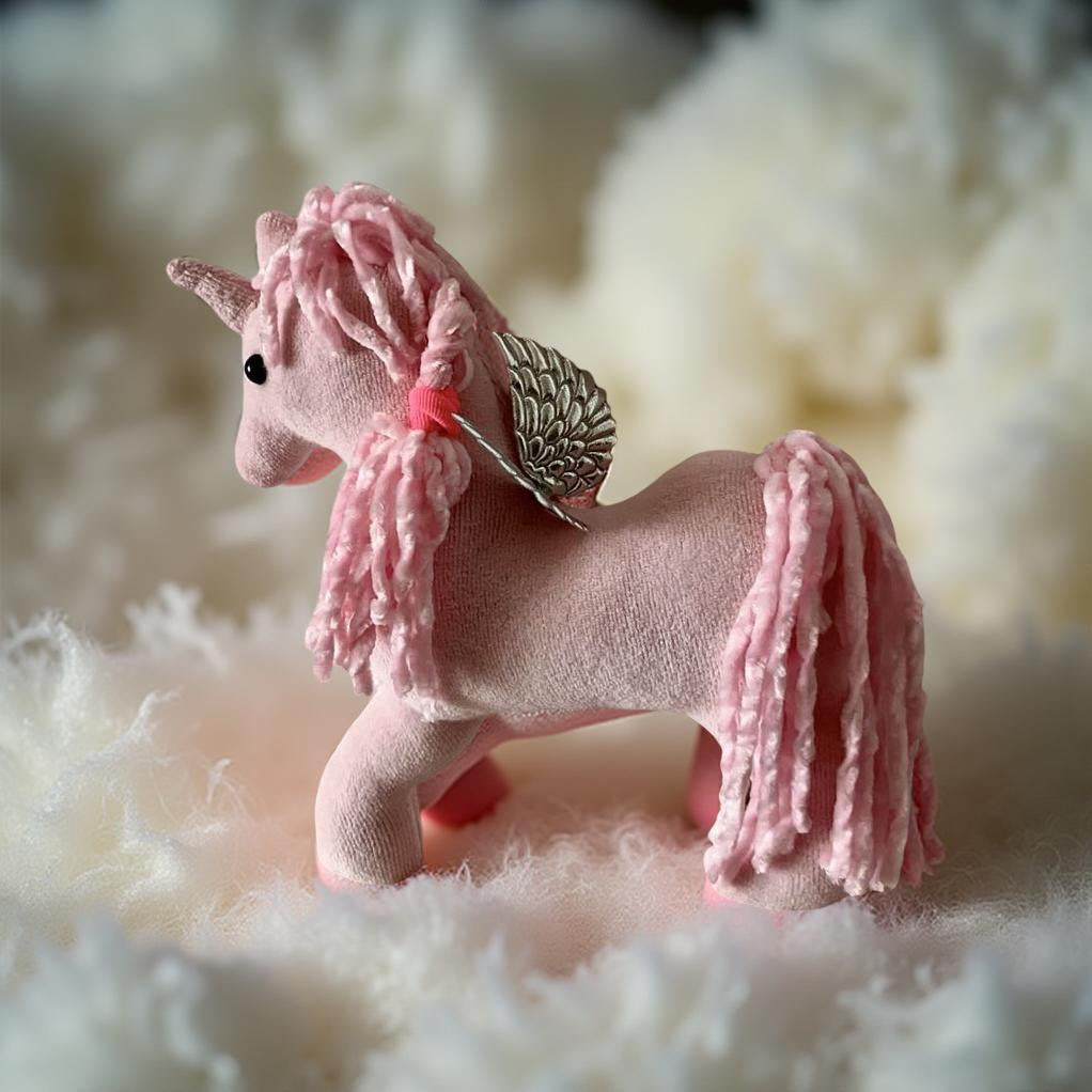 Meet Luna Starhoof, the sweetest unicorn plush to gallop straight into your heart. Crafted from ultra-soft pastel-pink cotton fleece and filled with plush thermofill stuffing, she’s not only irresistibly huggable but also machine washable, hypoallergenic, and safe for children aged 3 and up. Her delicate yarn mane and tail, along with shimmering wings, add a touch of magic—making her perfect for dreamy playtimes, bedtime cuddles, or as a whimsical décor piece. Whether as a gift for a little one or a treat for yourself, Luna brings a sprinkle of enchantment to every moment.
