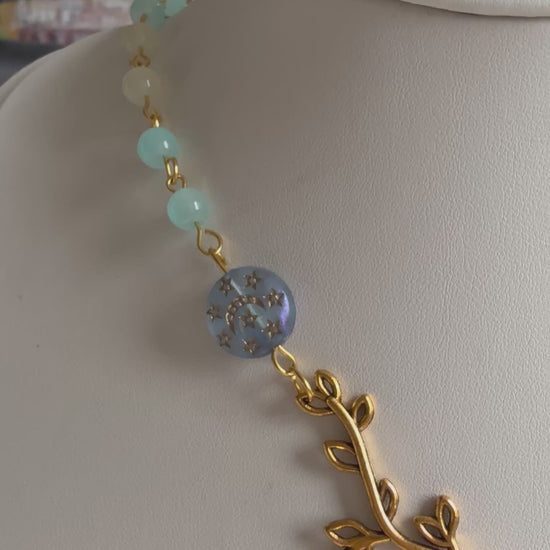 A soft, romantic necklace inspired by quiet garden chapels and timeless devotion. This piece features a detailed image pendant of Mary surrounded by a sparkling crystal halo, suspended from elegant gold-tone branch connectors and dreamy pastel beads.