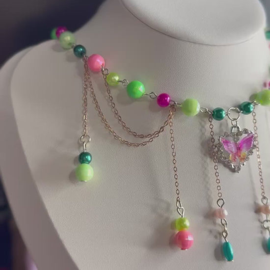 This playful, fairycore-inspired necklace is handmade with vibrant glass and pearl beads in shades of pink, green, and teal. Delicate rose-gold-tone chains drape elegantly across the collarbone, dancing with every movement. At its heart, a sparkling pink butterfly charm captures the essence of freedom, transformation, and whimsical wonder. ✨