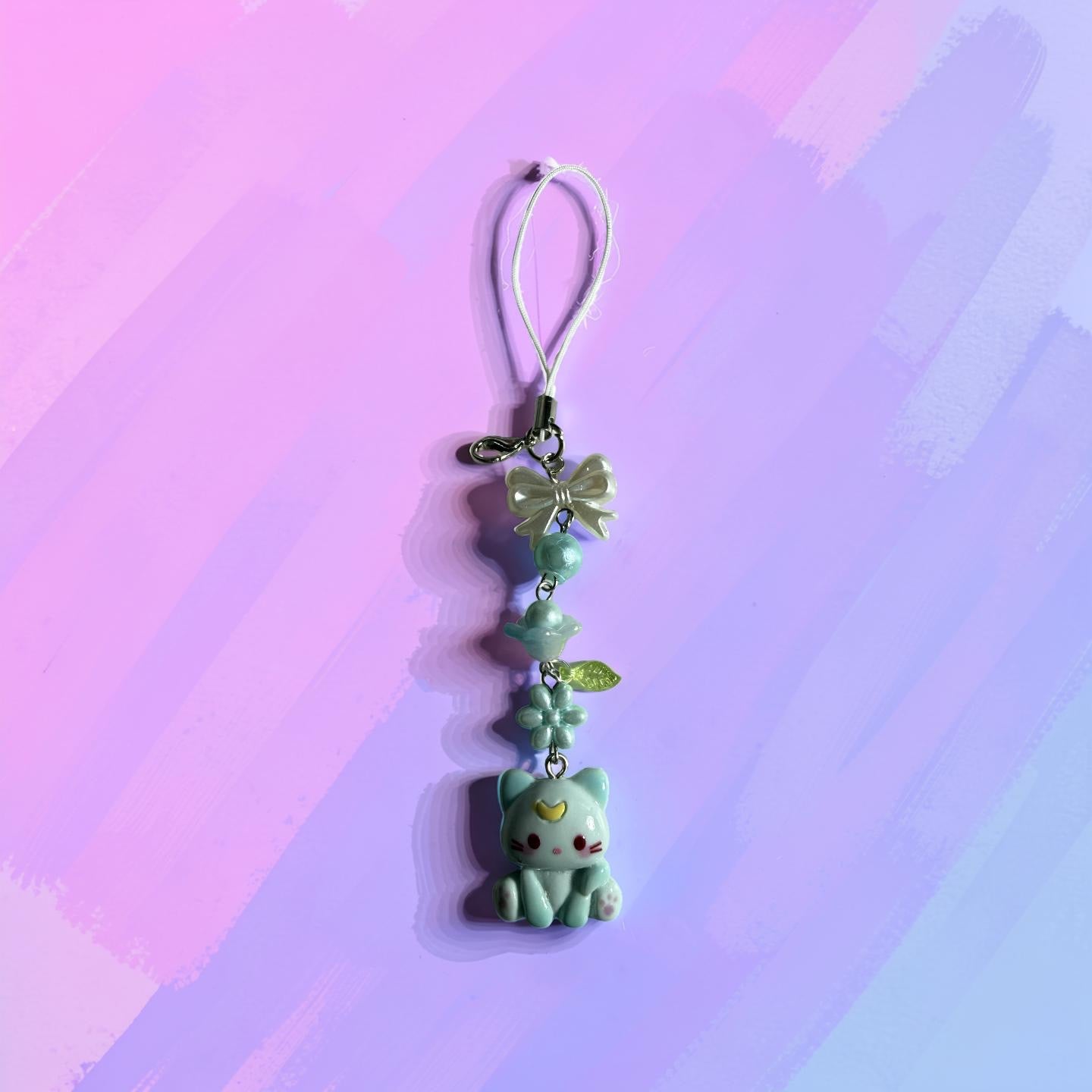 This whimsical charm features a cute mint-colored kitty pendant paired with delicate pastel details including a bow, tiny planet bead, and floral charm. The soft colors and playful design create a magical kawaii aesthetic that makes your phone, bag, or keys instantly more unique.