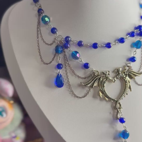 Unleash your inner queen with the Mother of Dragons necklace – a bold, regal statement piece inspired by powerful fantasy icons. Twin dragon charms form a heart centerpiece, symbolizing fire, strength, and loyalty. Surrounded by cascading silver chain links, glimmering blue glass beads, and faceted drops, this piece is perfect for dragon tamers, fantasy lovers, and cosplay royalty alike.