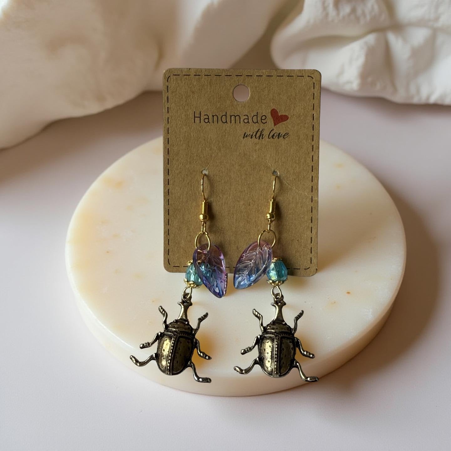 Dare to stand out with the Mystic Beetle Earrings. Featuring antique-style beetle charms paired with iridescent leaves and sparkling beads, these earrings combine mystical nature vibes with a bold statement look. Perfect for lovers of unique, gothic, or fairycore jewelry.