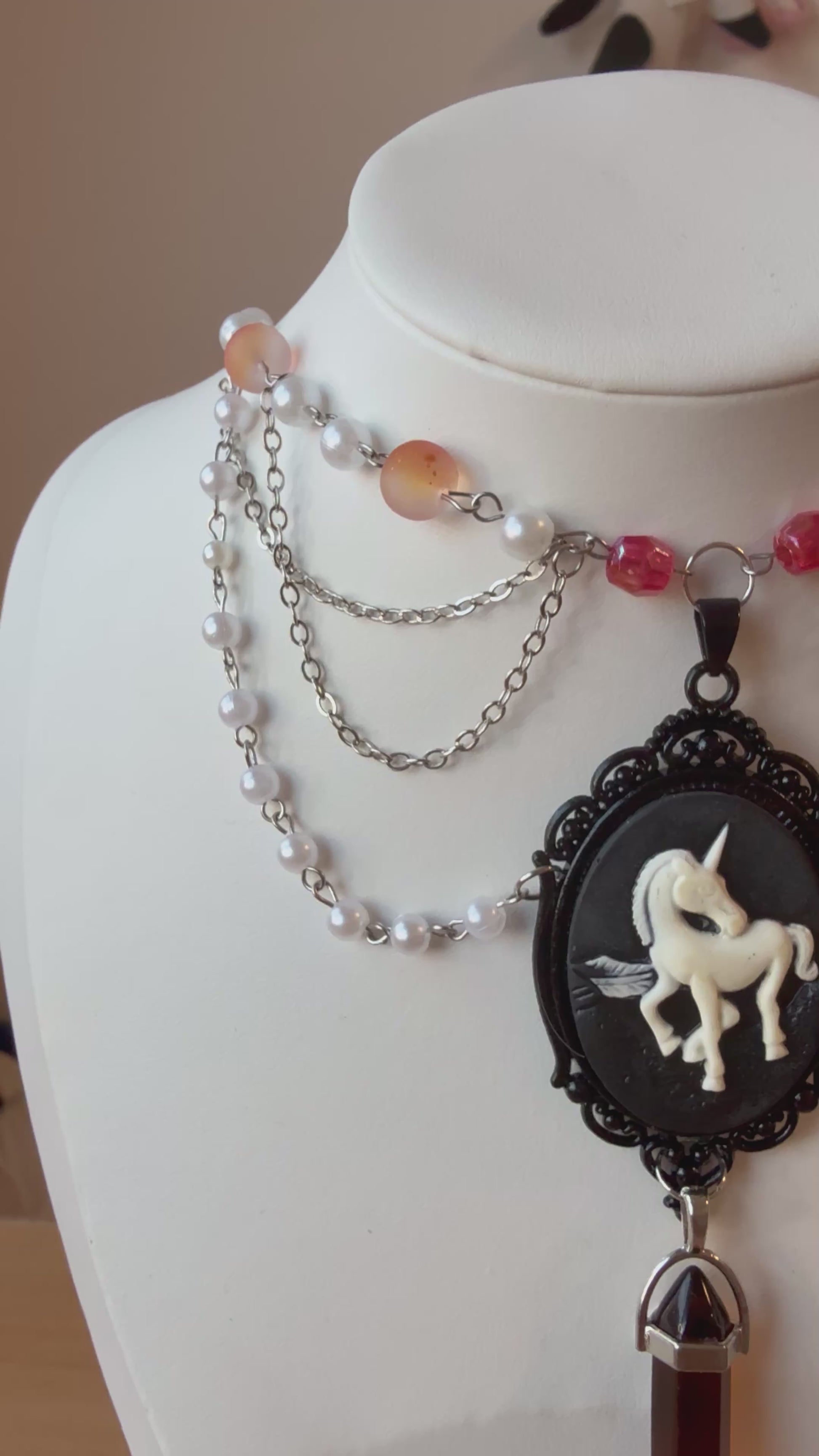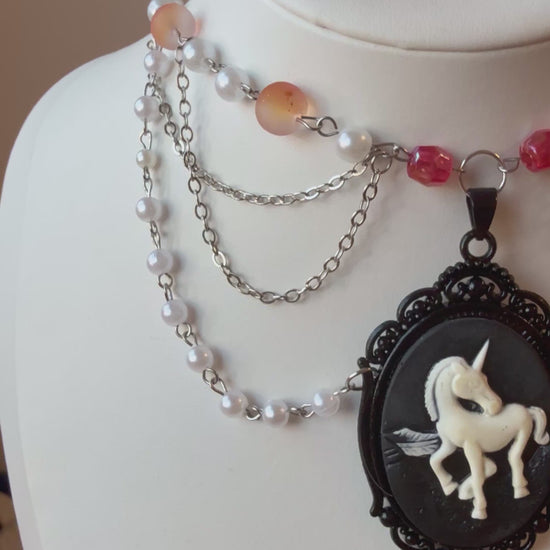 This enchanting piece features a vintage-style unicorn cameo framed in black filigree, paired with silver chains, soft pearls, and rosy crystal beads, finished with a dark gemstone pendant that captures the essence of midnight magic.