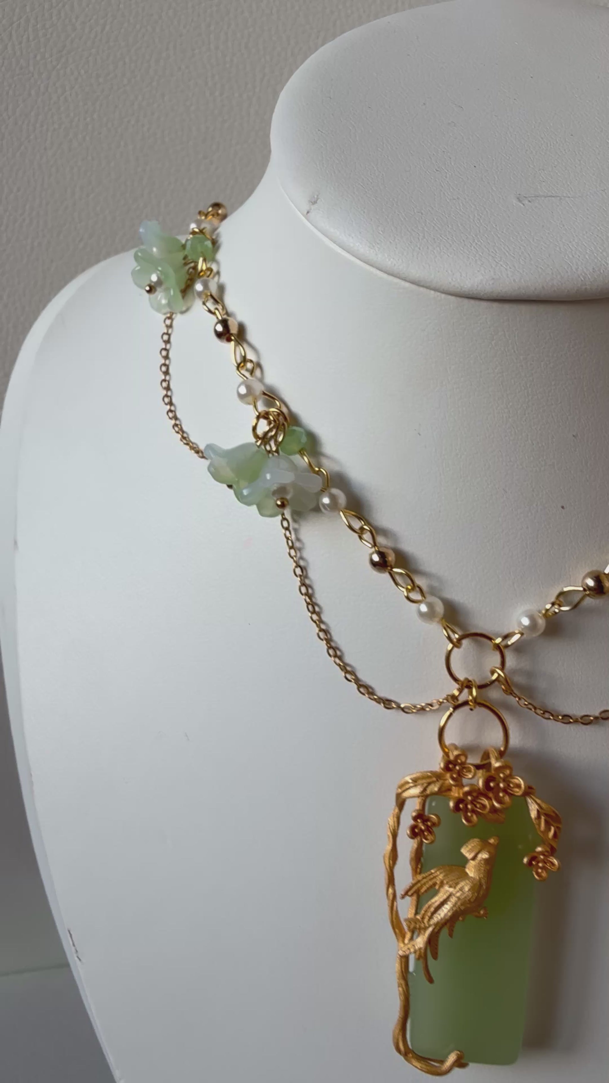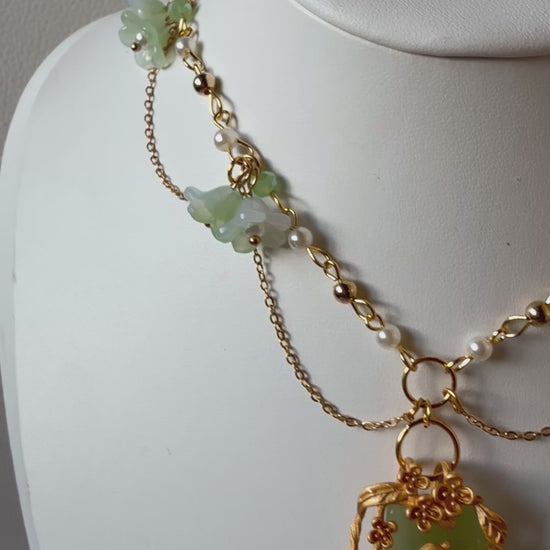 The Song of the Willow Necklace is a one-of-a-kind, fairycore-inspired statement piece featuring a delicate bird resting on a jade-green pendant wrapped in golden vines.