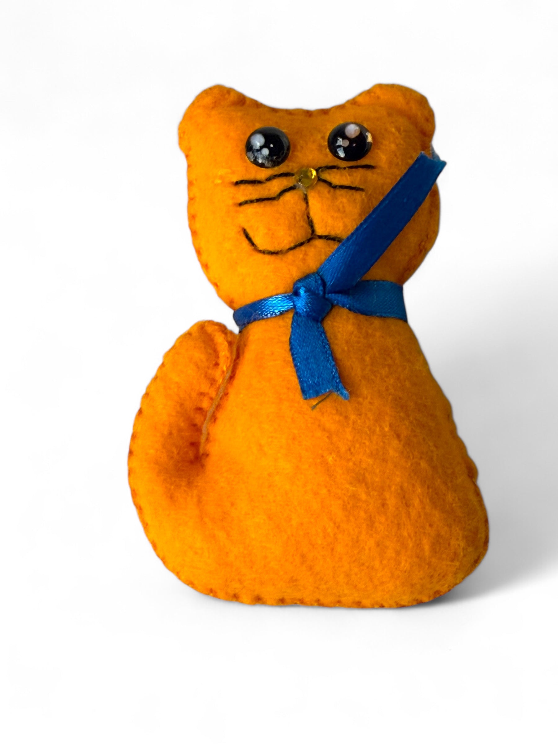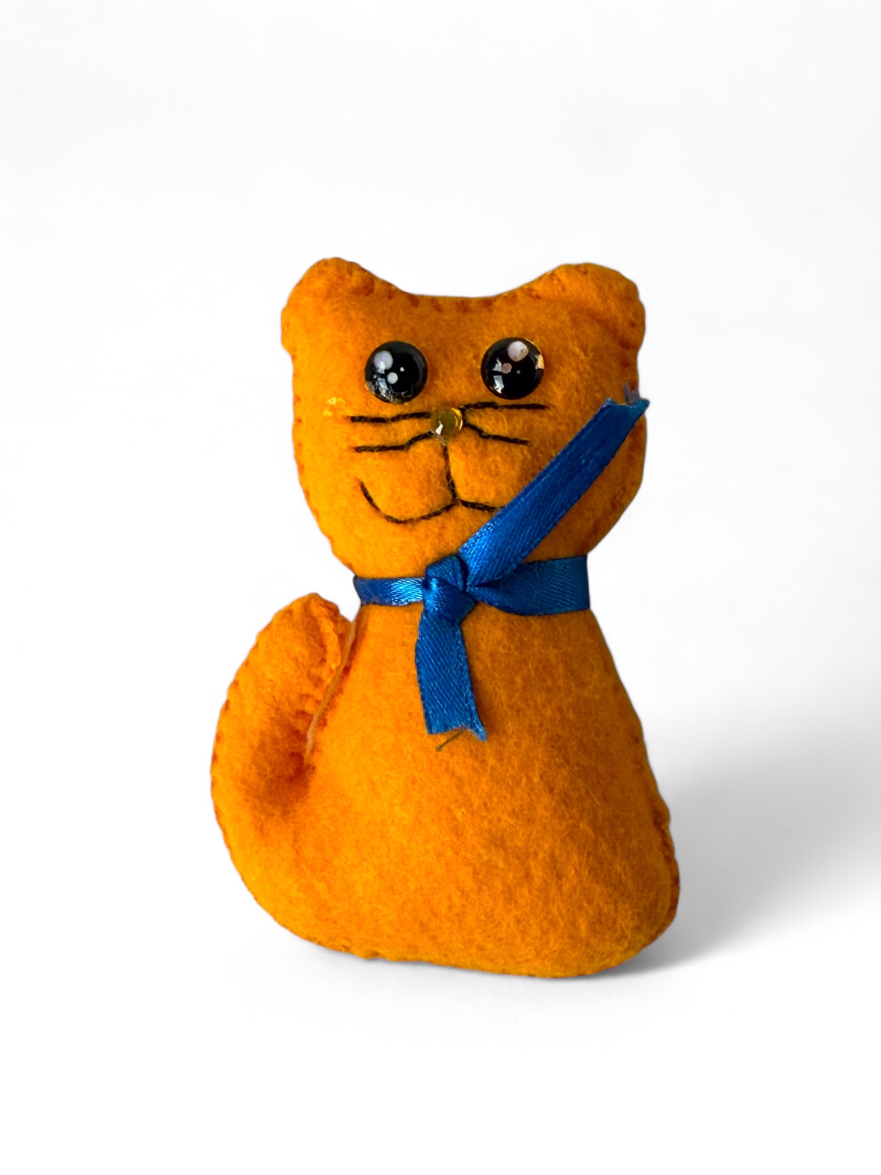 Say hello to SunnyWhiskers, the cheerful little kitty full of sunshine and sweetness! This palm-sized plush cat is handmade from bright orange hypoallergenic felt and filled with lightweight thermofill. Finished with a vivid blue satin bow and big shiny eyes, it’s the perfect mini gift, desk companion, or pocket pal for children and cat lovers alike. Safe for kids 3+ and easy to care for.