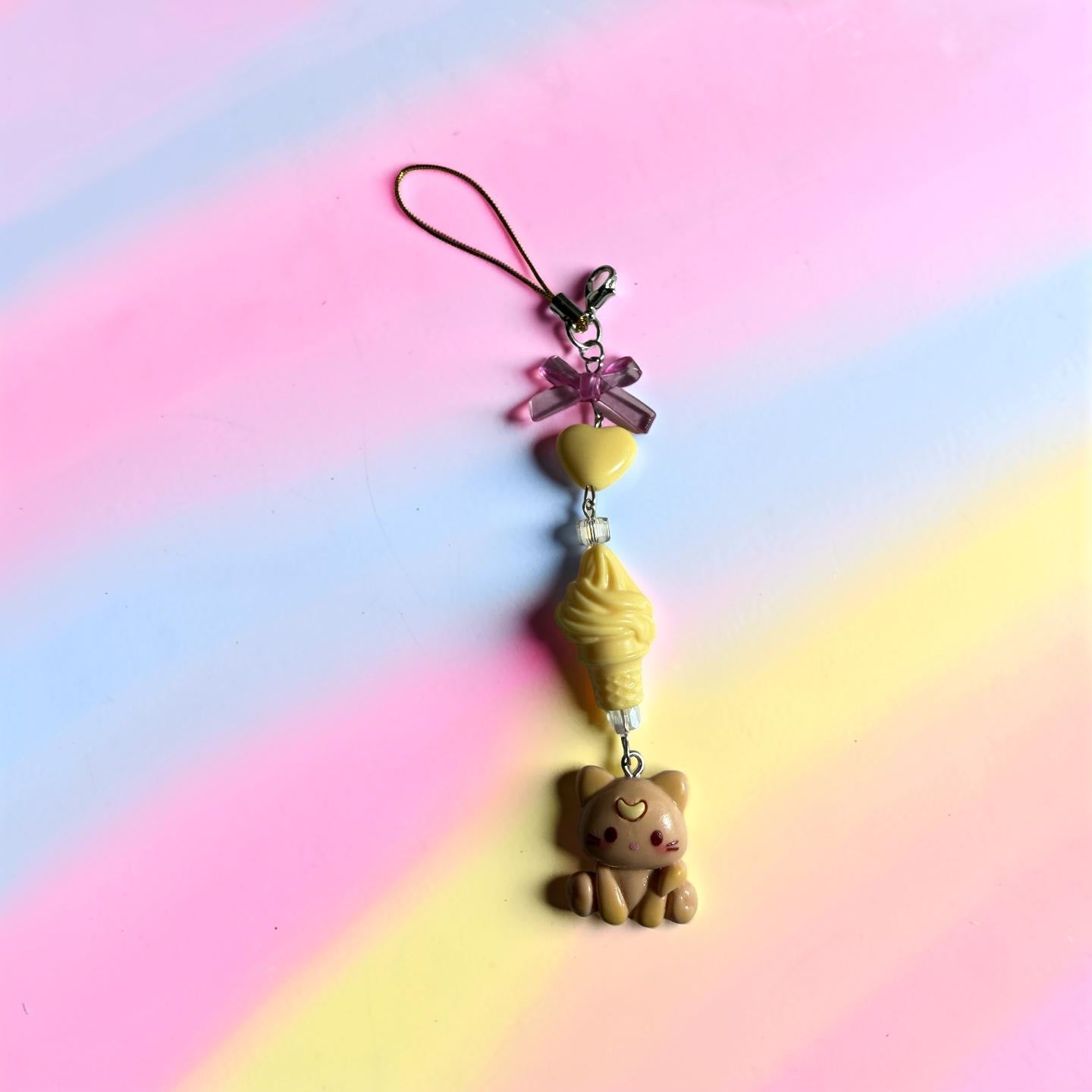 This playful charm features a cute little kitty pendant paired with a pastel yellow ice cream charm, a soft pink bow, and a sweet heart bead. The pastel colors and whimsical design create a dreamy kawaii aesthetic that makes your phone, bag, or keys instantly more fun and unique.