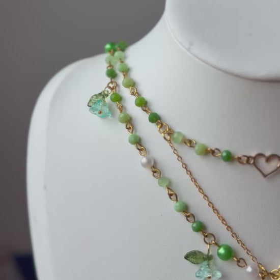 This layered necklace features green and pearl-like beads, delicate butterfly charms, and a golden heart accent. At its center hangs a striking deep-green crystal pendant, symbolizing balance, healing, and natural magic.