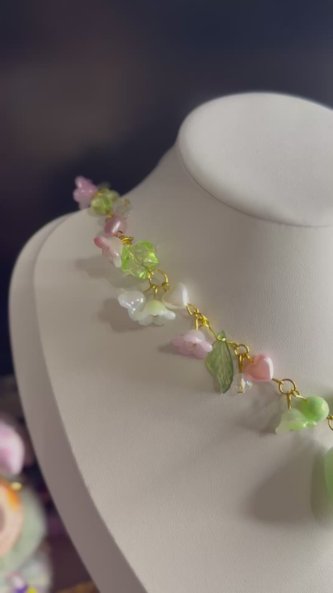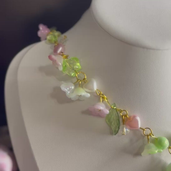 A delicate celebration of springtime magic, Sylvara Dewdrop captures the gentleness of a misty morning in an enchanted glade. Adorned with tiny glass blossoms, pastel leaves, and soft-toned beads, this necklace centers around a dewdrop-shaped natural gemstone — a symbol of purity and balance.