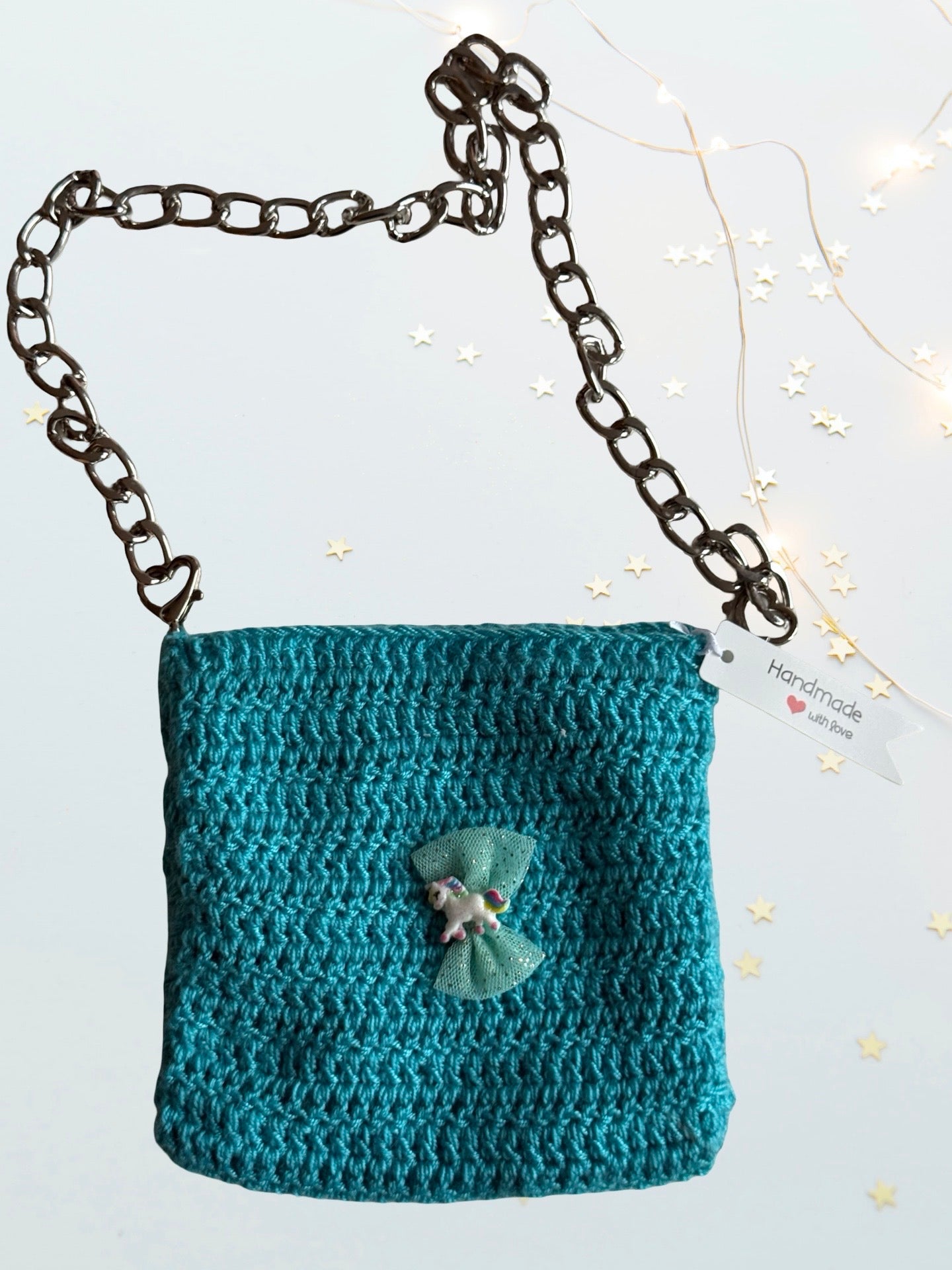 A magical handmade mini crossbody bag crafted from soft teal yarn with a cute unicorn charm sitting on a sparkly tulle bow. The perfect little bag for carrying a phone, small wallet, keys, or tiny treasures — ideal for kids, but also a fun accessory for adults who love whimsical, fairy-inspired fashion.