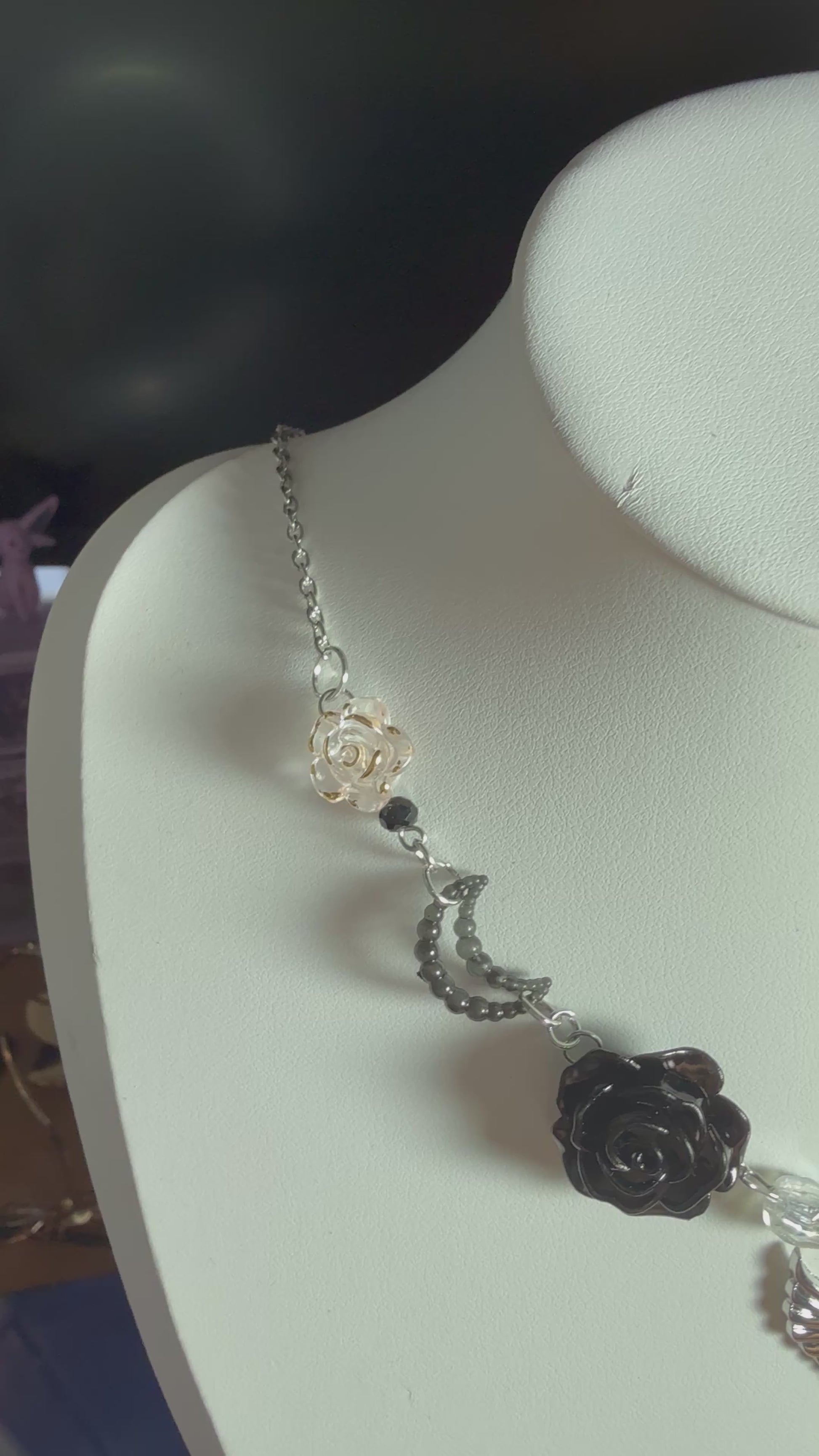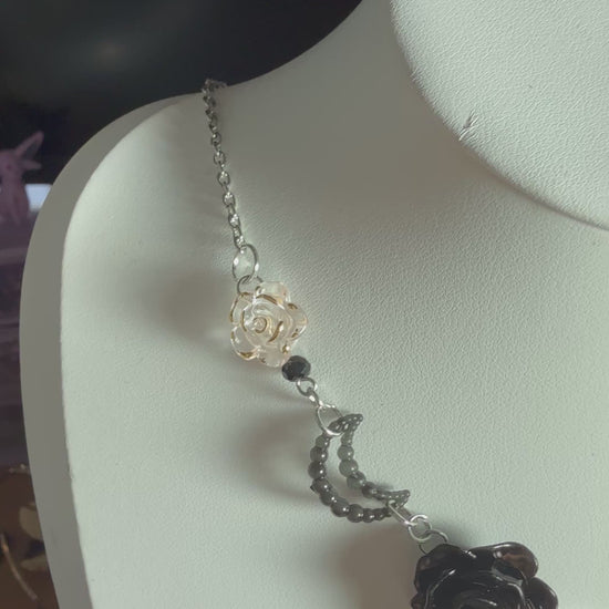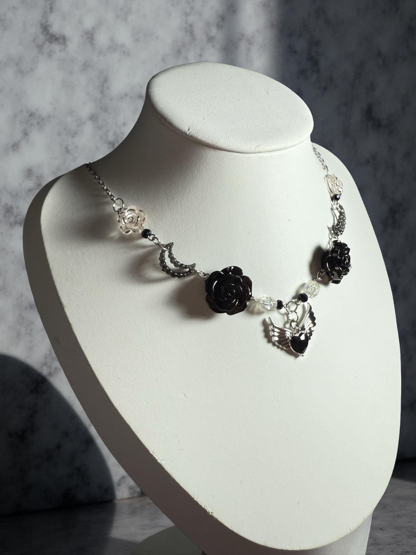 Unveil your dark elegance with Morgana’s Wings – a gothic-inspired necklace that combines black roses, crescent moons, and a winged heart pendant. Symbolizing strength, transformation, and eternal love, this piece radiates both mystery and beauty.