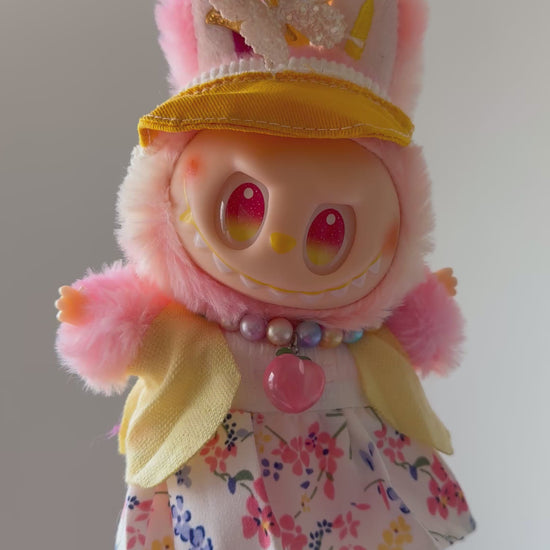 Meet your new pastel cutie! This Lafufu custom plush is dressed in a dreamy, hand-styled outfit: a fluffy pink kitty hood, sunny yellow visor cap with glittery ears, a floral A-line dress, soft yellow cardigan and a pearly necklace with a pink heart charm. A top clip lets you hang her on a bag or display at home.