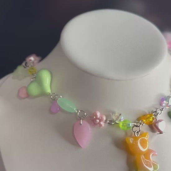 Let your inner pastel dream come to life with Whisker Bloom, a whimsical necklace handcrafted with colorful charm beads and a sweet gradient kitty centerpiece. Featuring a delightful mix of hearts, butterflies, flowers, and playful shapes in soft candy tones, this necklace adds a pop of magic to any outfit.