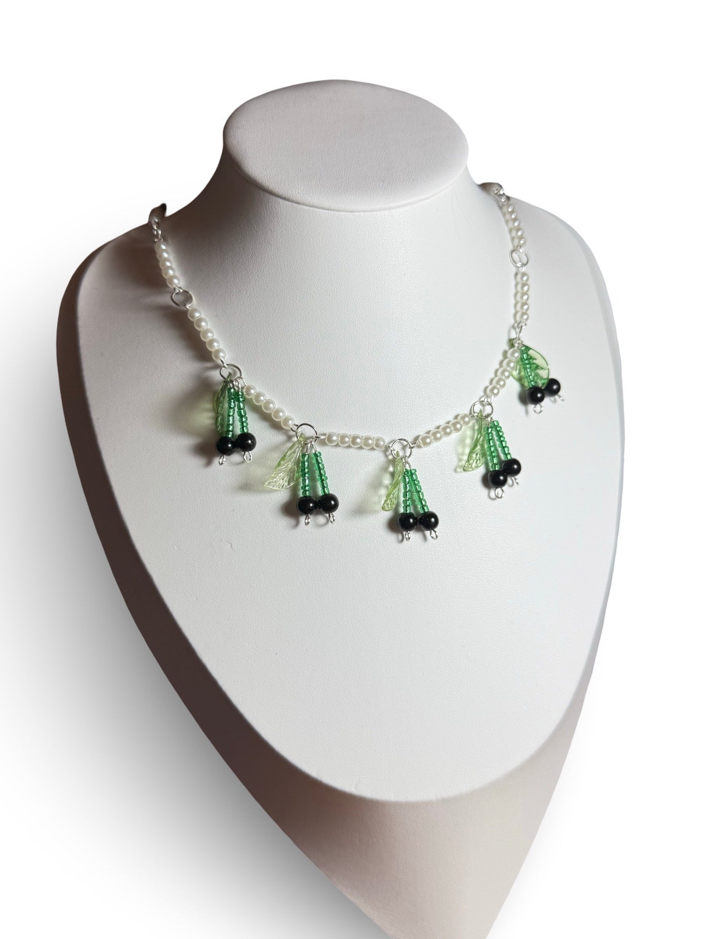 Sweet and bold — the Whispers of Cherrywood necklace is a playful tribute to nature's tiny treasures. Featuring glossy black cherry charms made of glass beads and delicate green leaves, each pendant hangs from a string of pearlescent beads and silver-toned chain links.