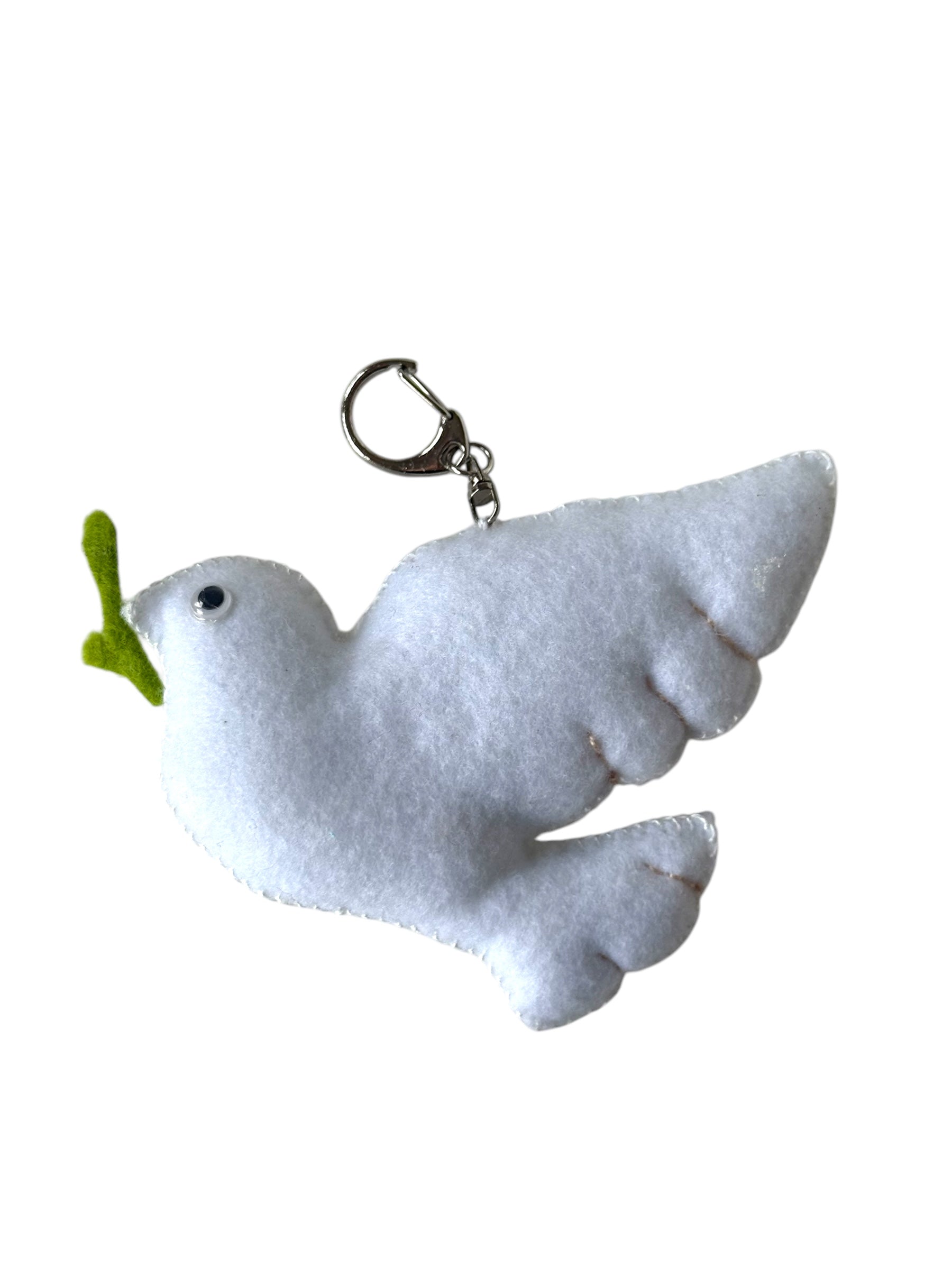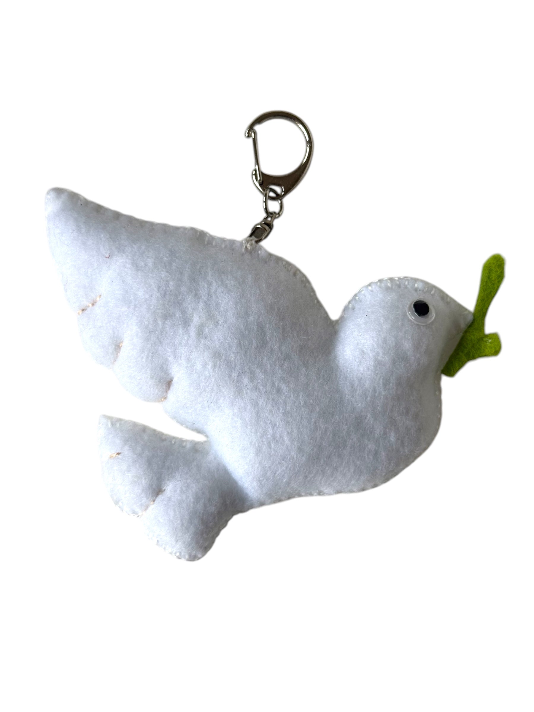 Carry a little symbol of peace and kindness with you wherever you go. This handmade felt dove keychain is soft, lightweight, and filled with hypoallergenic thermofill. Thoughtfully stitched and detailed with a green olive branch, it’s a charming accessory for keys, backpacks, or gift bags. Safe for children aged 3 and up, it also makes a lovely party favor or token of hope.